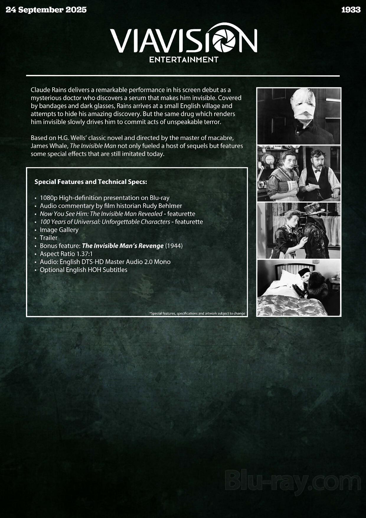 A film that features some special effects still imitated today, the release of James Whale's The Invisible Man on Blu-ray also includes many Special Features, plus a bonus feature: The Invisible Man's Revenge (1944)!