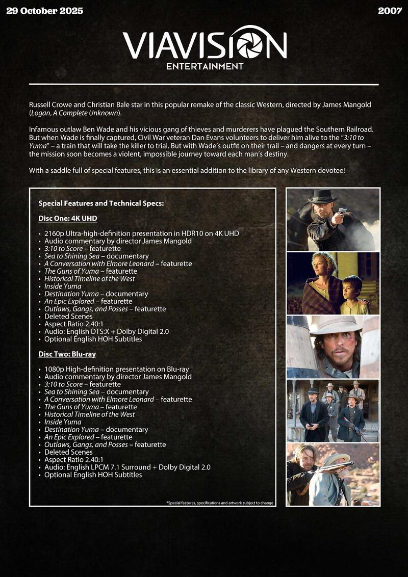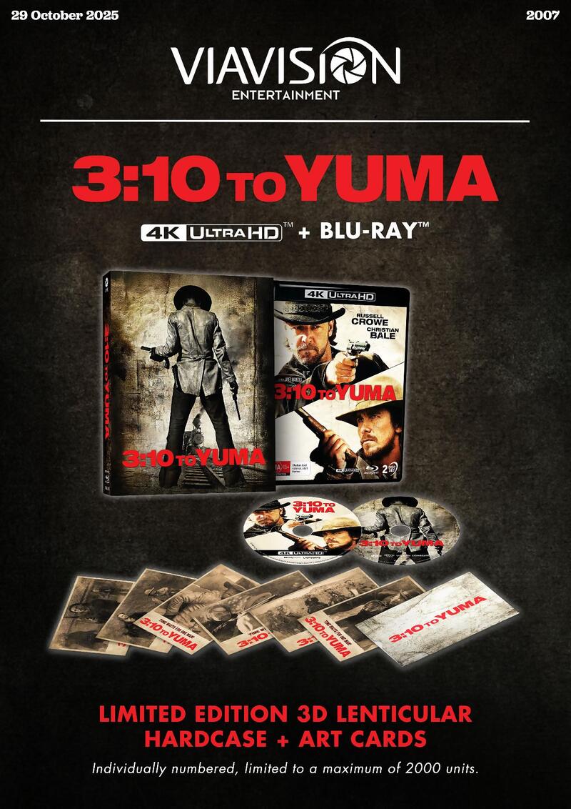 Saddle up for 3:10 TO YUMA (2007), the popular remake of the classic Western starring Russell Crowe and Christian Bale, and directed by James Mangold (Logan, A Complete Unknown). With a holster full of Special Features, this is an essential addition to the library of any Western devotee!