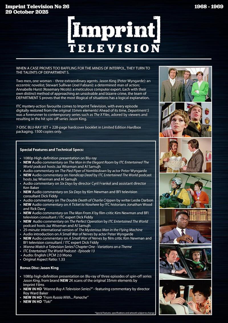 ITC mystery-action favourite comes to Imprint Television, with every episode digitally restored from the original 35mm elements! Ahead of its time, Department S was a forerunner to contemporary series such as The X Files, adored by viewers and resulting in the hit spin-off series Jason King.