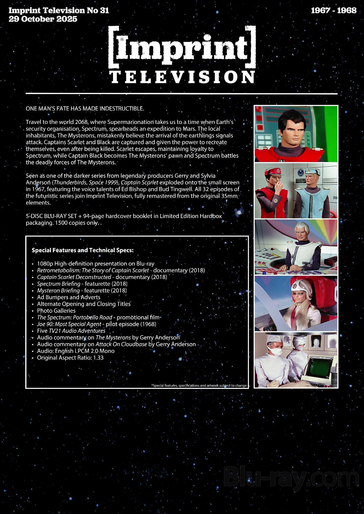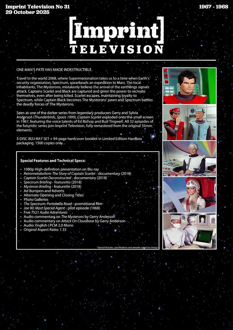 Seen as one of the darker series from legendary producers Gerry and Sylvia Anderson (Thunderbirds, Space: 1999), Captain Scarlet exploded onto the small screen in 1967, featuring the voice talents of Ed Bishop and Bud Tingwell. All 32 episodes of the futuristic series join Imprint Television, fully remastered from the original 35mm elements.