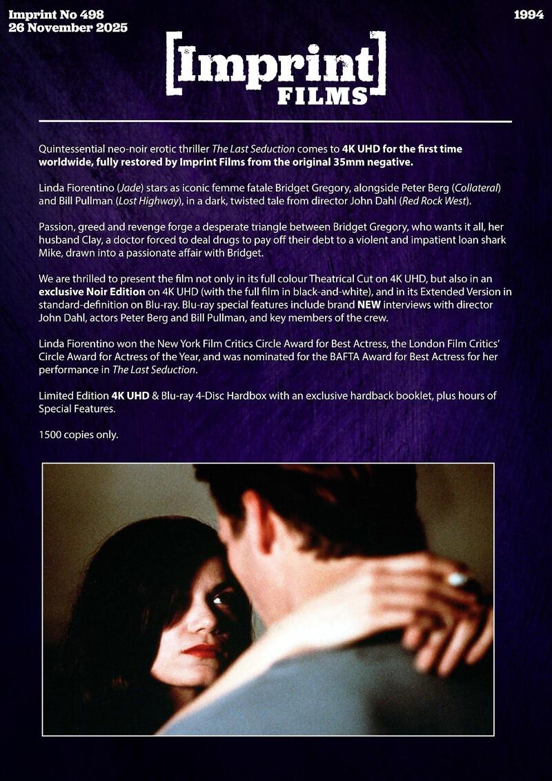 The Last Seduction (1994), starring Linda Fiorentino, Bill Pullman, Peter Berg, Dean Norris, and Brien Varady. The release is scheduled to arrive on the market on November 26.