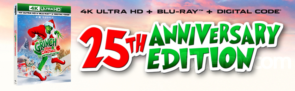 Description: Celebrate the 25th Anniversary of Jim Carrey as the Grinch with this remastered 4K Ultra HD Anniversary edition! Discover the true meaning of the holiday season with the live action adaptation of the beloved classic, Dr. Seuss' How the Grinch Stole Christmas. Starring Jim Carrey as The Grinch, director Ron Howard and producer Brian Grazer reimagine one of the most enduring holiday stories of all time. Why is The Grinch (Carrey) such a grouch? No one seems to know, until little Cindy Lou Who (Taylor Momsen) takes matters into her own hands and turns both Whoville and the Grinch's world upside down, inside out…and funny side up. Filled with dazzling scenery, special effects, makeup and costumes, this is an adventure "that can make your heart grow three sizes—if you're not laughing too hard!" (Steve Murray, Atlanta Journal-Constitution).