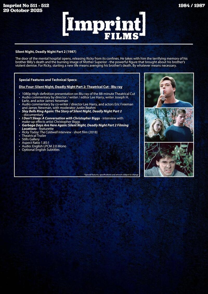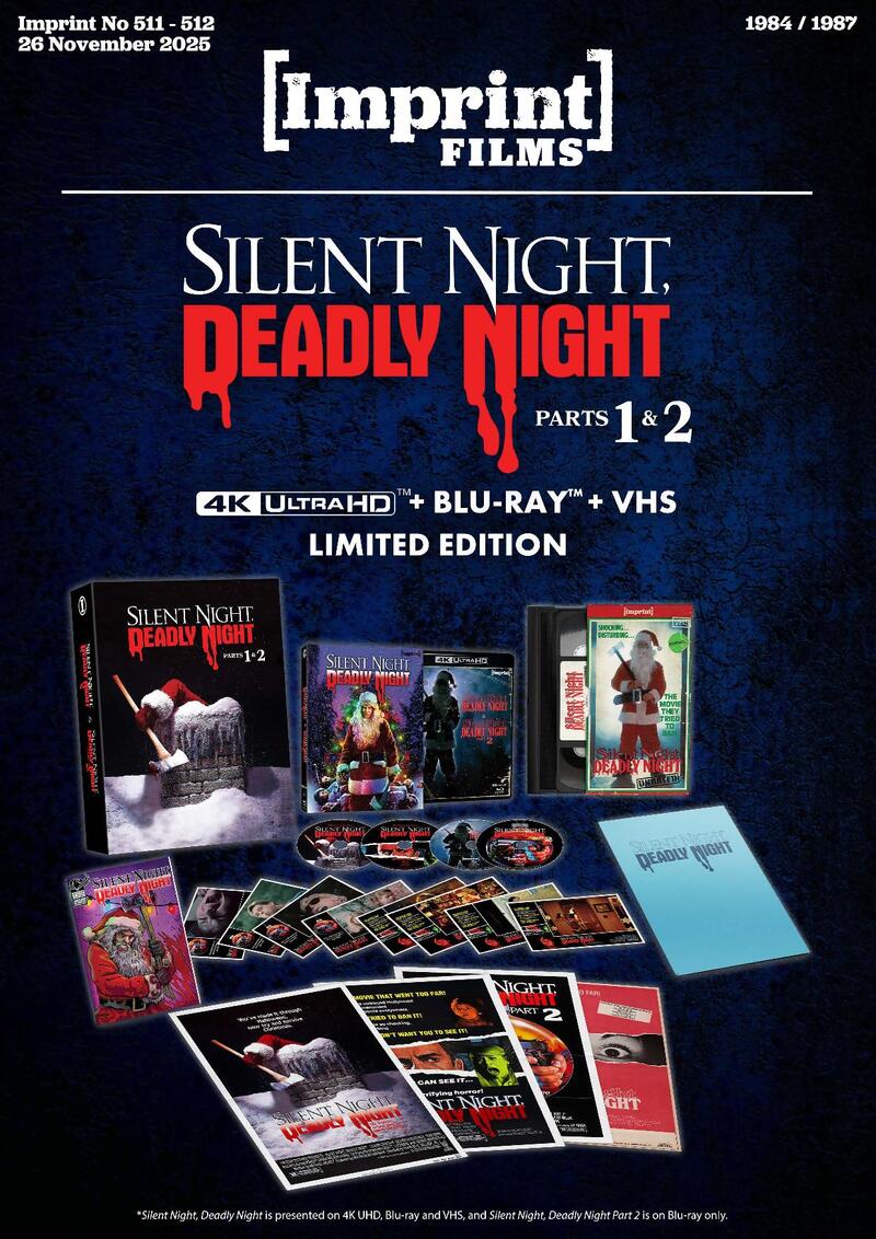 The original Theatrical Cut for Silent Night, Deadly Night (1984) is included on both 4K UHD in Dolby Vision and Blu-ray, plus the longer Unrated Cut on Blu-ray, and Silent Night, Deadly Night Part 2 (1987) is also restored in grizzly HD on Blu-ray. Both films are accompanied by hours of Special Features that dive into the making of this ferocious seasonal franchise.