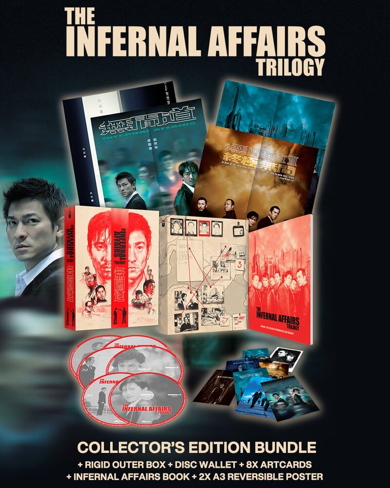 A landmark of Hong Kong cinema, the INFERNAL AFFAIRS trilogy tells an unforgettable story of loyalty, betrayal, and fate on both sides of the law. Spanning three films, the trilogy follows the parallel lives of a police mole buried deep within the Triads and an undercover officer trapped inside the criminal underworld, two men destined to collide in a deadly game of deception.