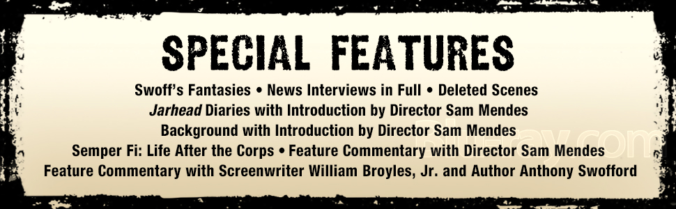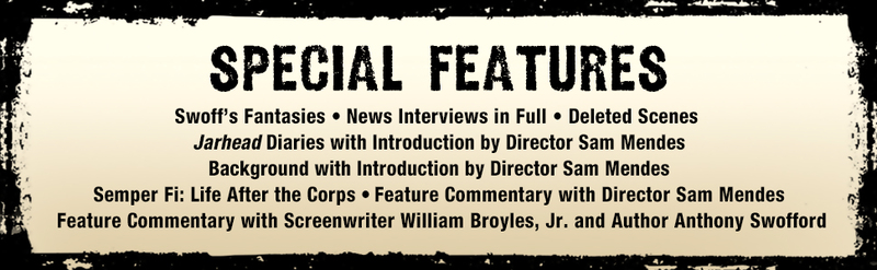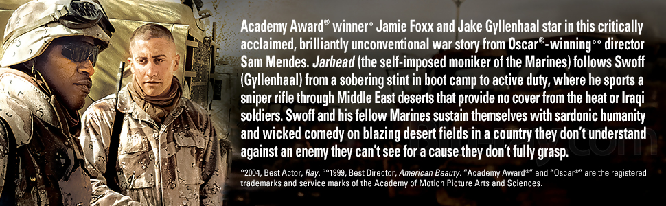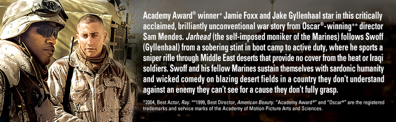 Description: Academy Award winner Jamie Foxx and Jake Gyllenhaal star in this critically acclaimed, brilliantly unconventional war story from Oscar-winning director Sam Mendes. Jarhead (the self-imposed moniker of the Marines) follows Swoff (Gyllenhaal) from a sobering stint in boot camp to active duty, where he sports a sniper rifle through Middle East deserts that provide no cover from the heat or Iraqi soldiers. Swoff and his fellow Marines sustain themselves with sardonic humanity and wicked comedy on blazing desert fields in a country they don't understand against an enemy they can't see for a cause they don't fully grasp.