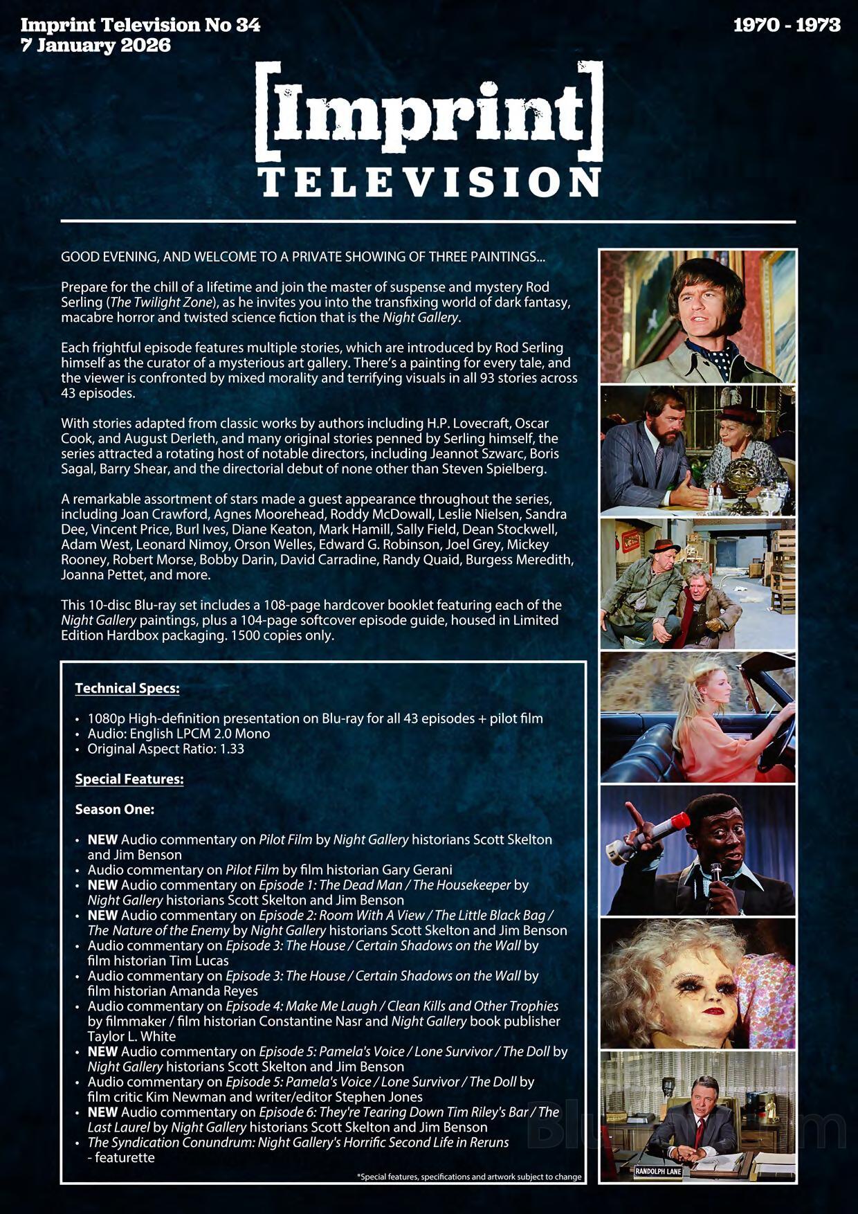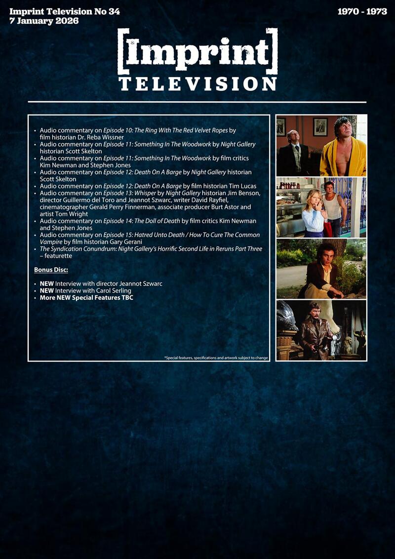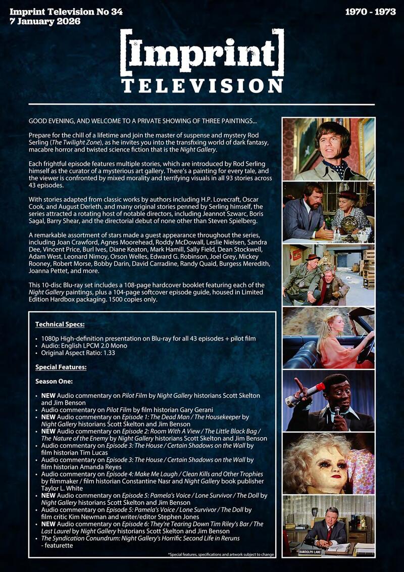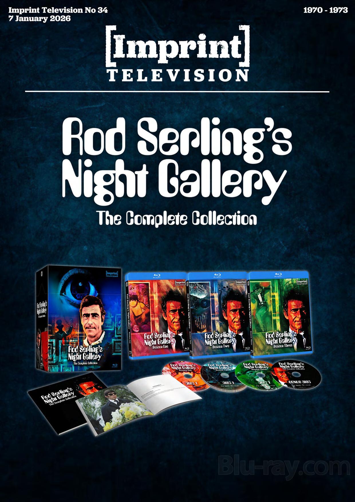 This 10-disc Blu-ray set includes a 108-page hardcover booklet featuring each of the Night Gallery paintings, plus a 104-page softcover episode guide, housed in Limited Edition Hardbox packaging. 1500 copies only.
