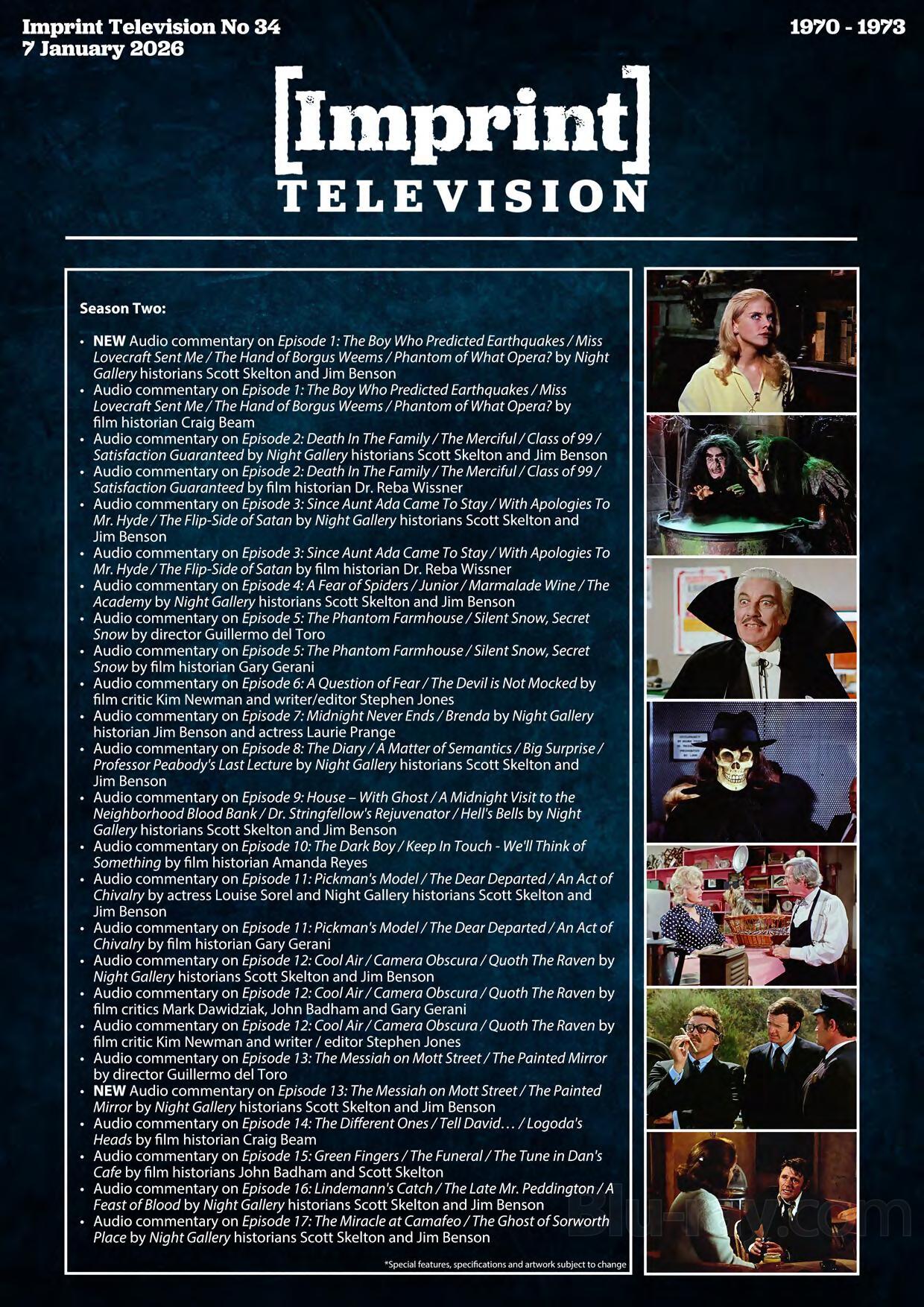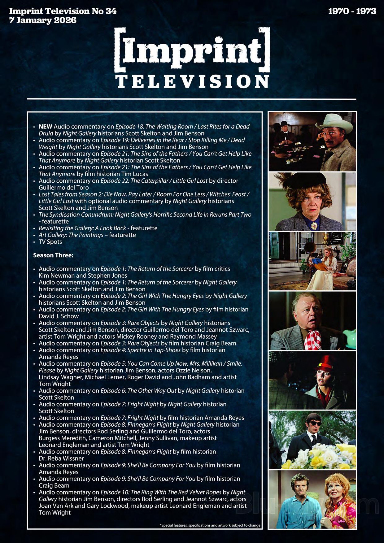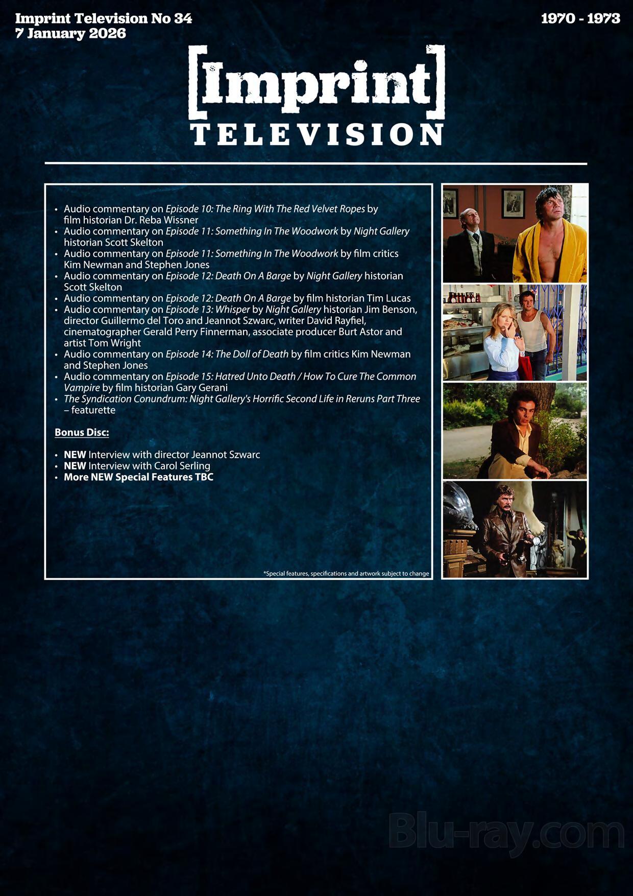 This 10-disc Blu-ray set includes a 108-page hardcover booklet featuring each of the Night Gallery paintings, plus a 104-page softcover episode guide, housed in Limited Edition Hardbox packaging. 1500 copies only.