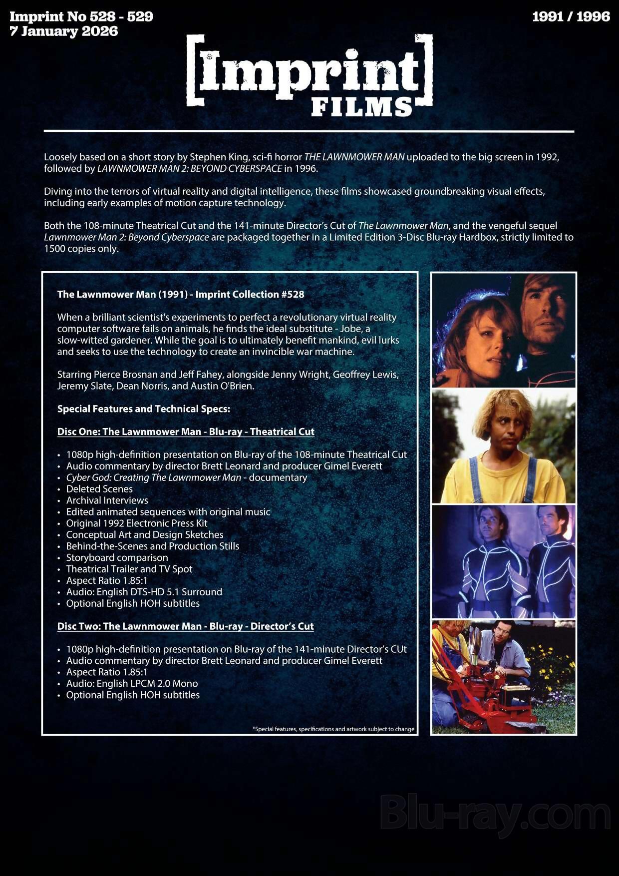 Both the 108-minute Theatrical Cut and the 141-minute Director's Cut of The Lawnmower Man, and the vengeful sequel Lawnmower Man 2: Beyond Cyberspace are packaged together in a Limited Edition 3-Disc Blu-ray Hardbox, strictly limited to 1500 copies only.