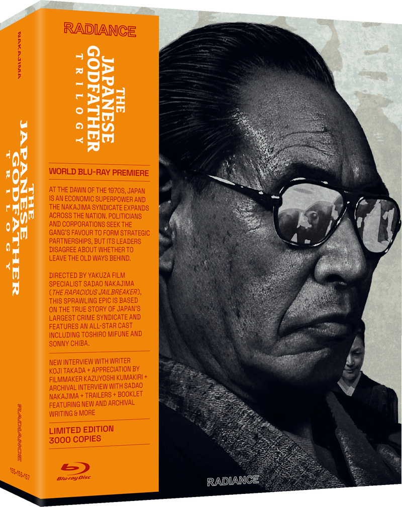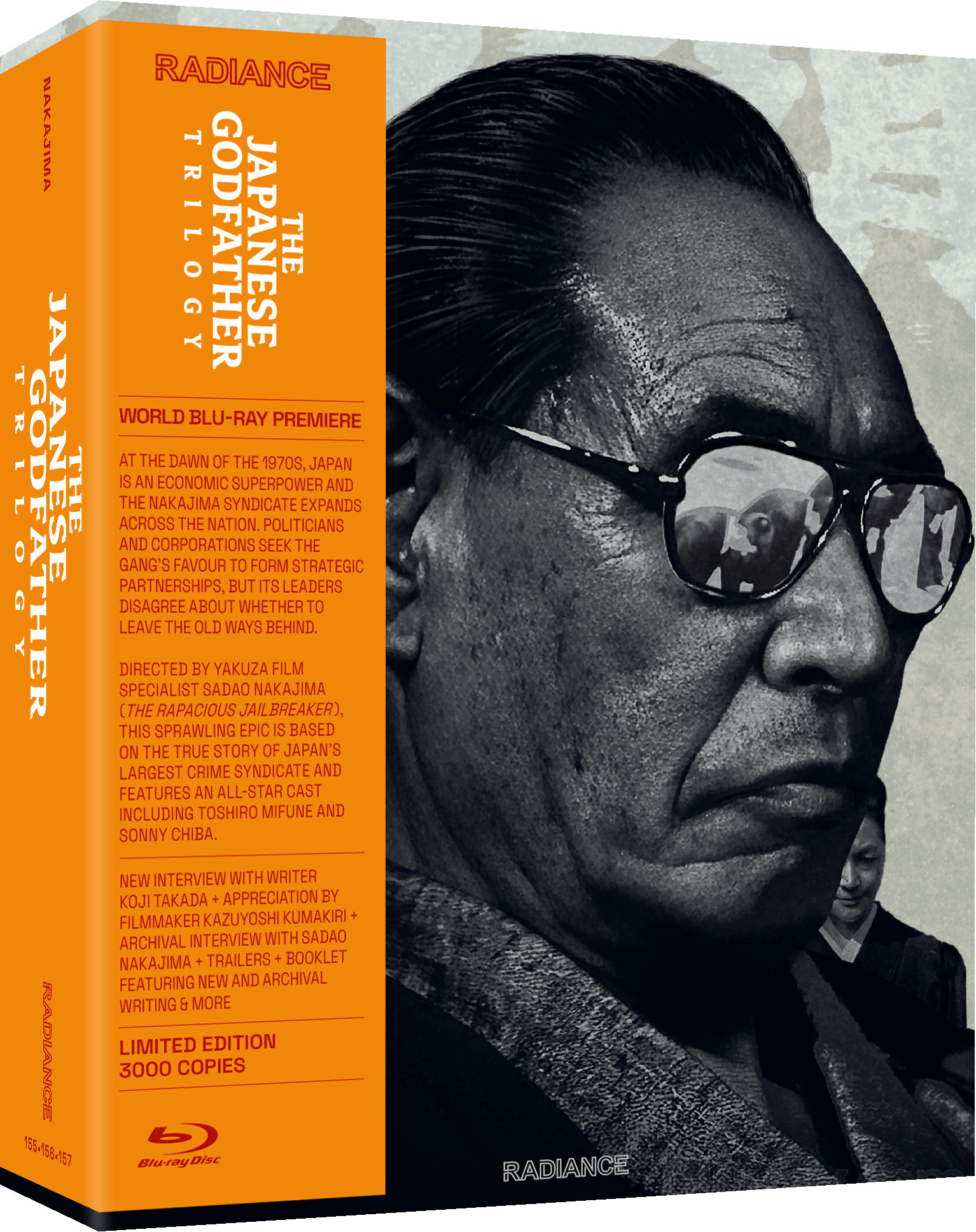 At the dawn of the 1970s, Japan is becoming an economic superpower and the Nakajima crime syndicate extends its grasp across the nation. Politicians and corporations seek the gang's favour to form strategic and highly prosperous partnerships, but its leaders disagree about whether to leave the old ways behind for the sake of money and respectability. Directed by Toei yakuza film specialist Sadao Nakajima (The Rapacious Jailbreaker), this sprawling epic is based on the true story of Japan's largest crime syndicate and features a cast of genre legends, including Koji Tsuruta (Big Time Gambling Boss, Sympathy for the Underdog), Bunta Sugawara (Battles Without Honour and Humanity) and Sonny Chiba (The Streetfighter, Hokuriku Proxy War).