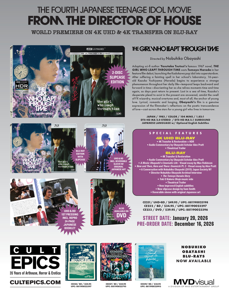 Cult Epics have provided final details for their upcoming 4K Blu-ray and Blu-ray releases of Nobuhiko Ôbayashi's The Girl Who Leapt Through Time (1983), starring Tomoyo Harada, Takako Irie, Toshinori Omi, Ittoku Kishibe, and Toshie Negishi. The two releases are scheduled to arrive on the market on January 20.