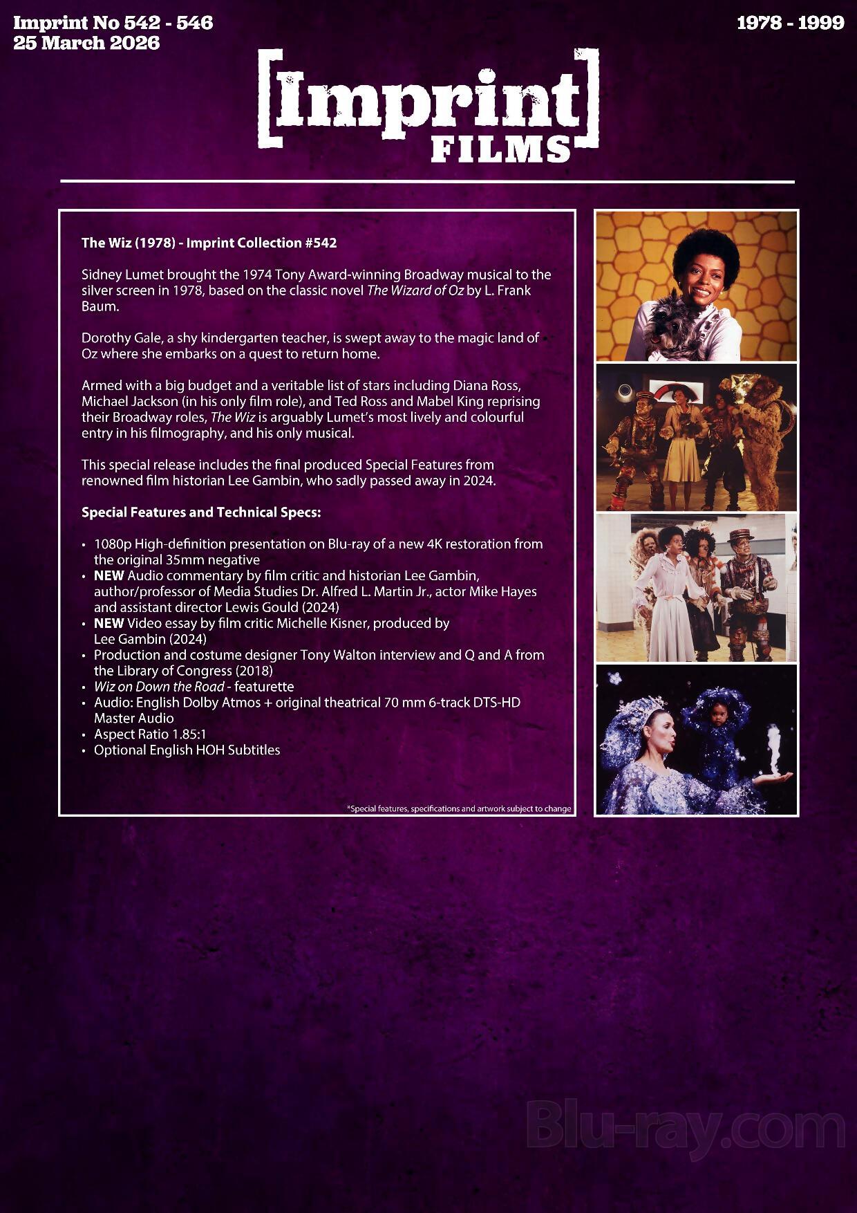 Sidney Lumet brought the 1974 Tony Award-winning Broadway musical to the silver screen in 1978, based on the classic novel The Wizard of Oz by L. Frank Baum. Dorothy Gale, a shy kindergarten teacher, is swept away to the magic land of Oz where she embarks on a quest to return home. Armed with a big budget and a veritable list of stars including Diana Ross, Michael Jackson (in his only film role), and Ted Ross and Mabel King reprising their Broadway roles, The Wiz is arguably Lumet's most lively and colourful entry in his filmography, and his only musical. This special release includes the final produced Special Features from renowned film historian Lee Gambin, who sadly passed away in 2024.