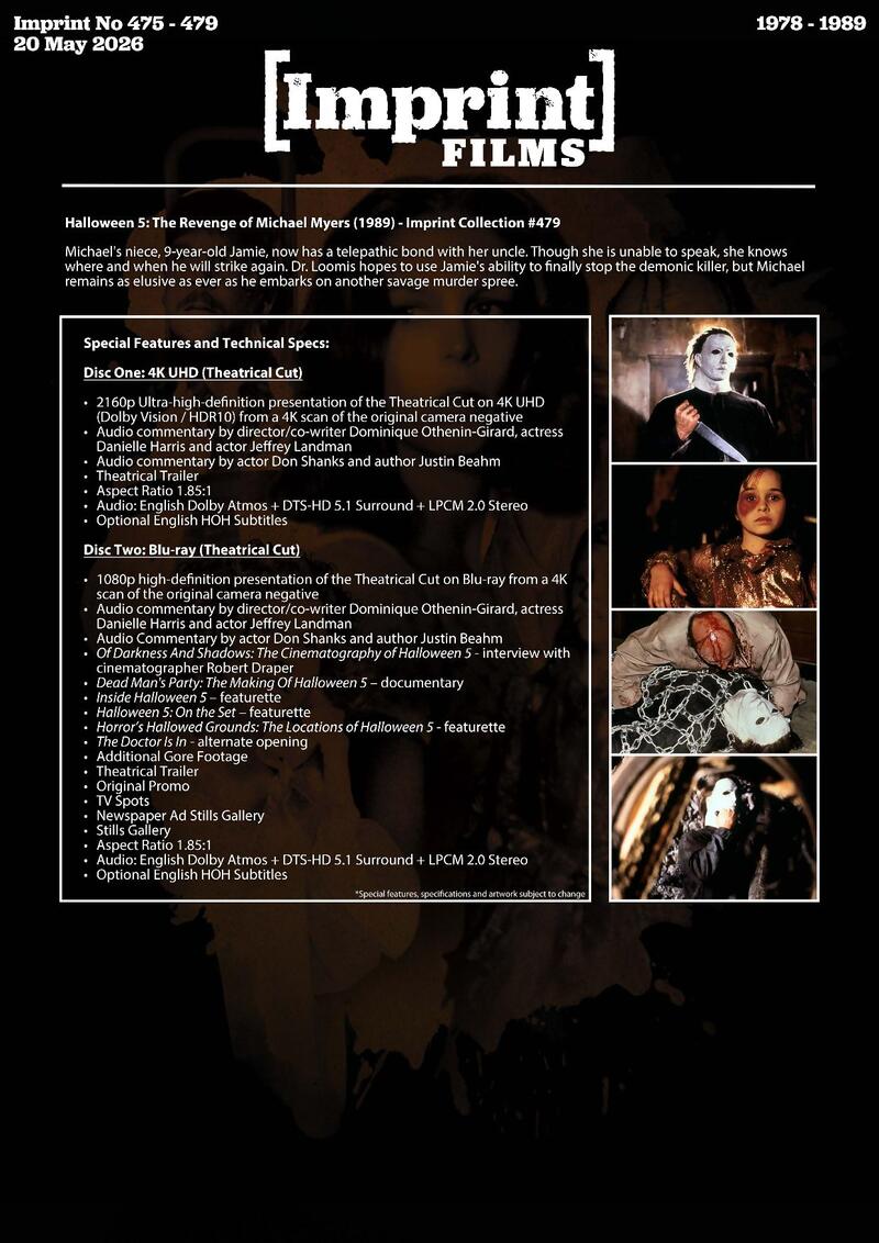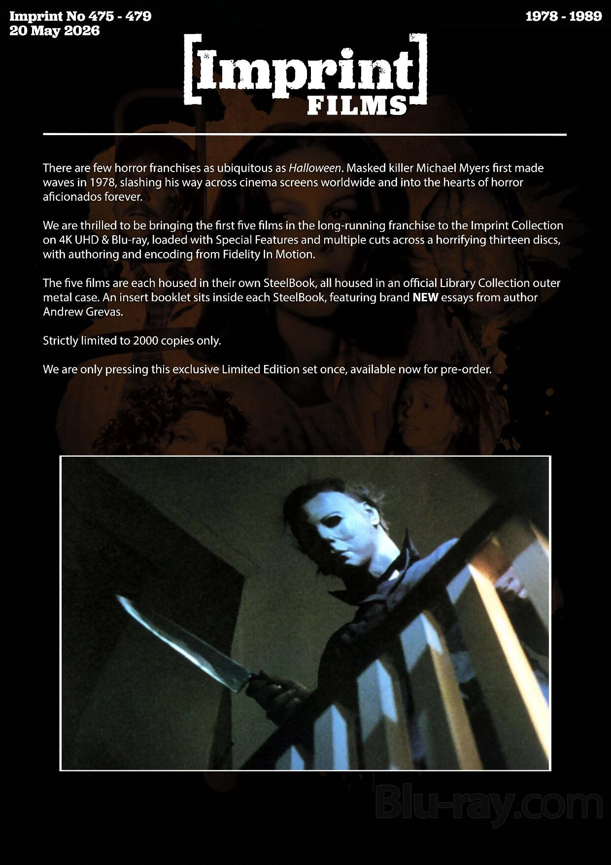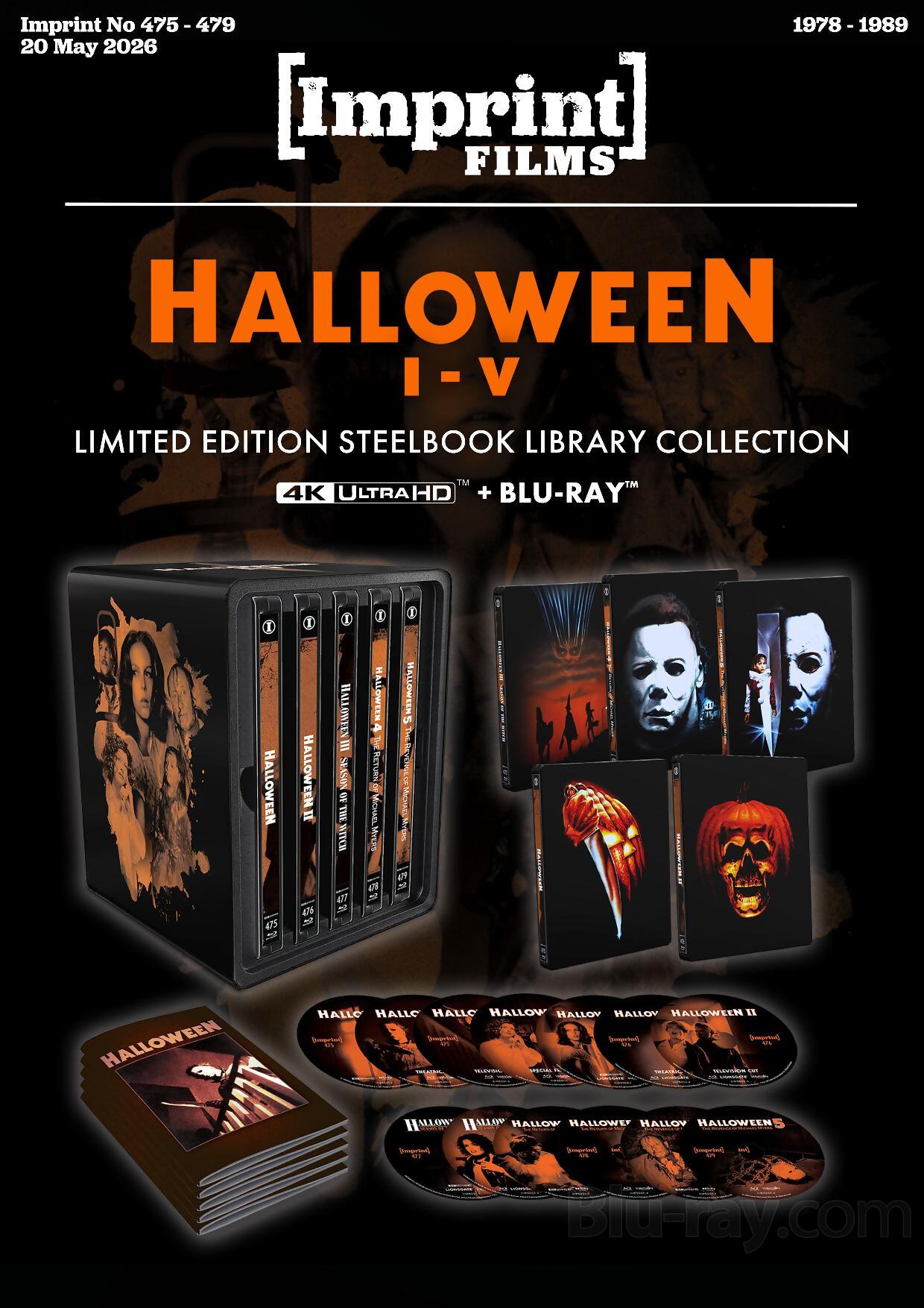 Label description: Own the first five films (1978-1989) on 4K Blu-ray and Blu-ray, each in their own SteelBook and housed in an official Library Collection outer metal case. An insert booklet accompanies each of the terrifying films, and features brand NEW essays from author Andrew Grevas.