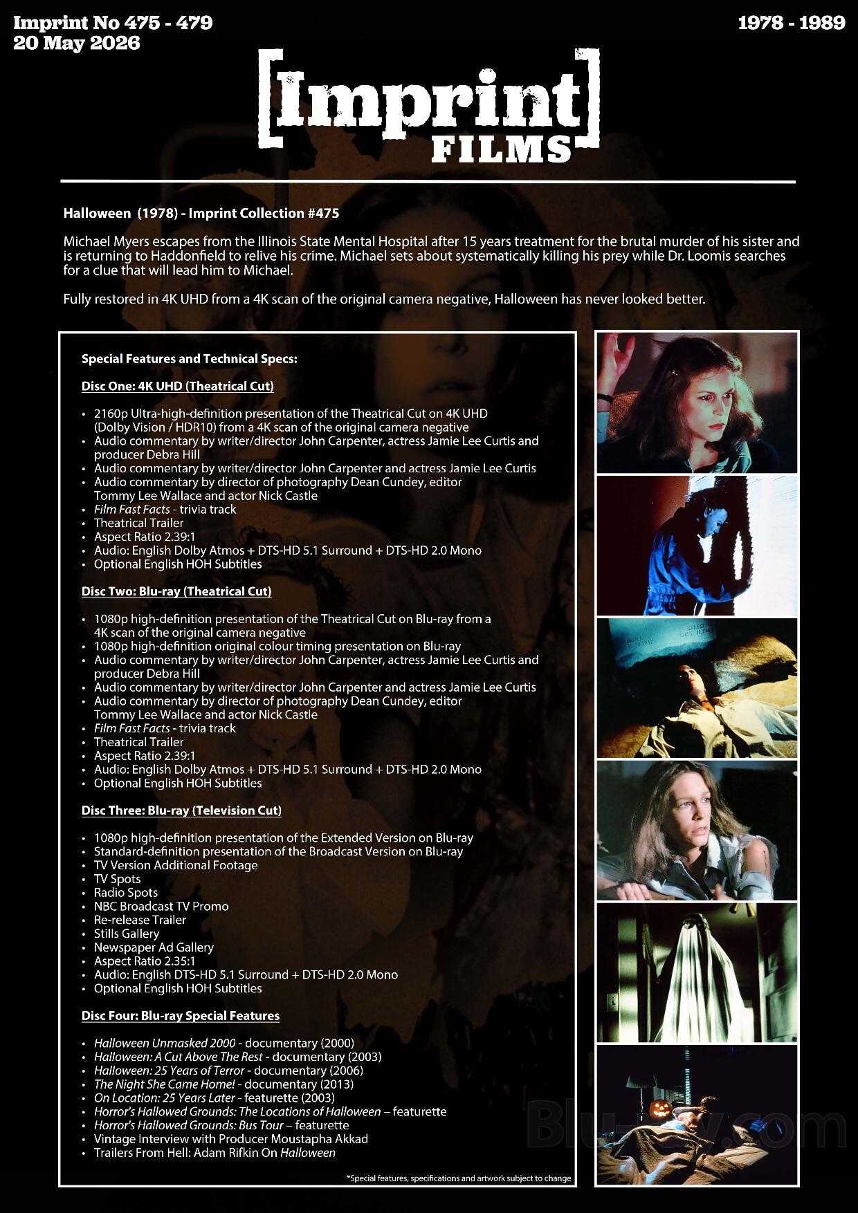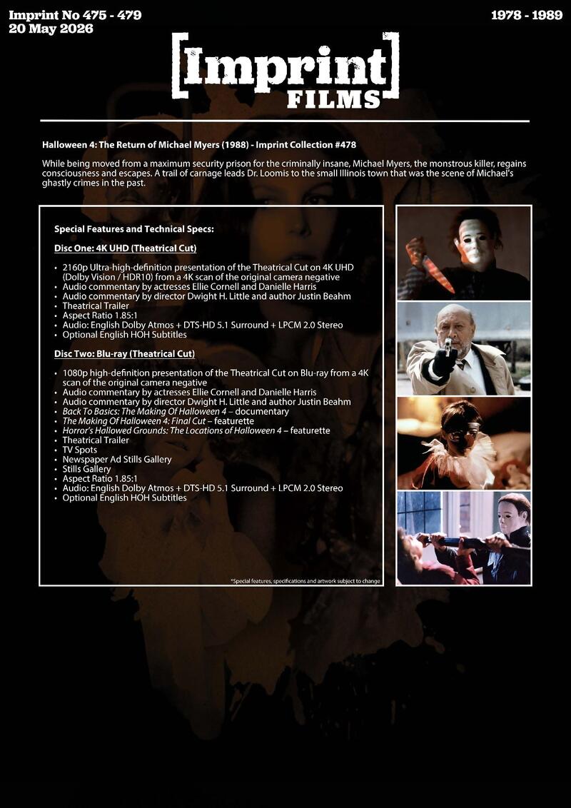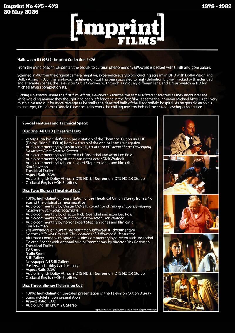 Label description: Own the first five films (1978-1989) on 4K Blu-ray and Blu-ray, each in their own SteelBook and housed in an official Library Collection outer metal case. An insert booklet accompanies each of the terrifying films, and features brand NEW essays from author Andrew Grevas.