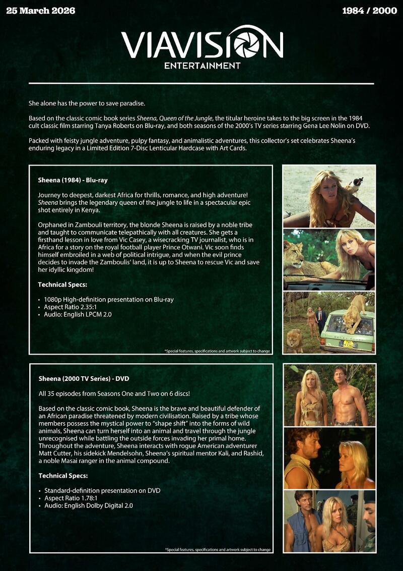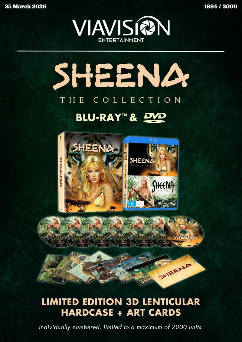 Sheena, Queen of the Jungle, the titular heroine takes to the big screen in the 1984 cult classic film starring Tanya Roberts on Blu-ray, and both seasons of the 2000's TV series starring Gena Lee Nolin on DVD.