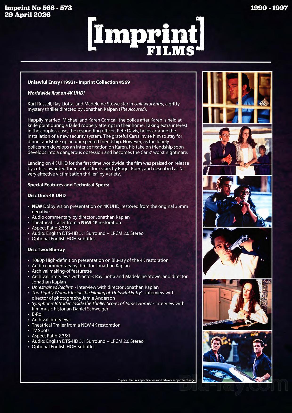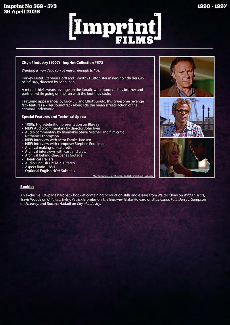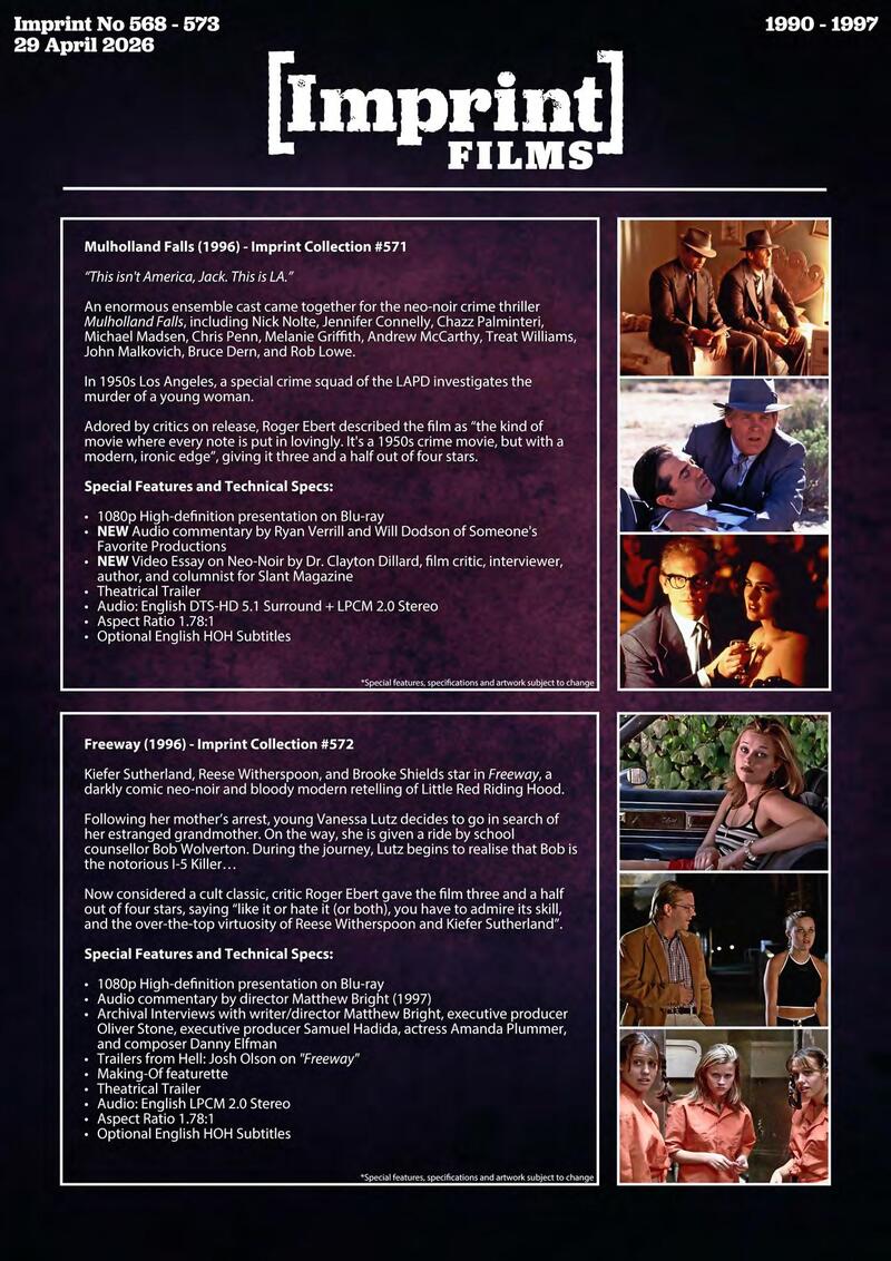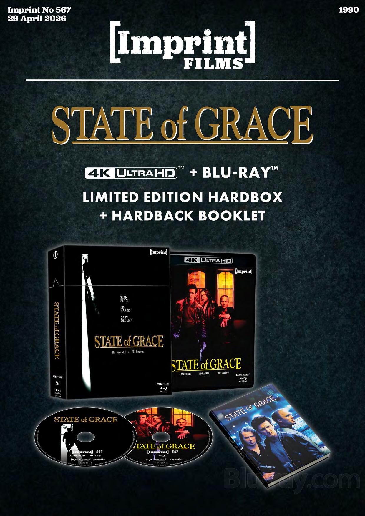 Australian label Imprint Films has announced its April batch of 4K Blu-ray and Blu-ray releases. They are: Dark Blue (2002), State of Grace (1990), and After Dark: Neo-Noir Cinema Collection Four (1990-1997). The three releases are scheduled to arrive on the market on April 29.