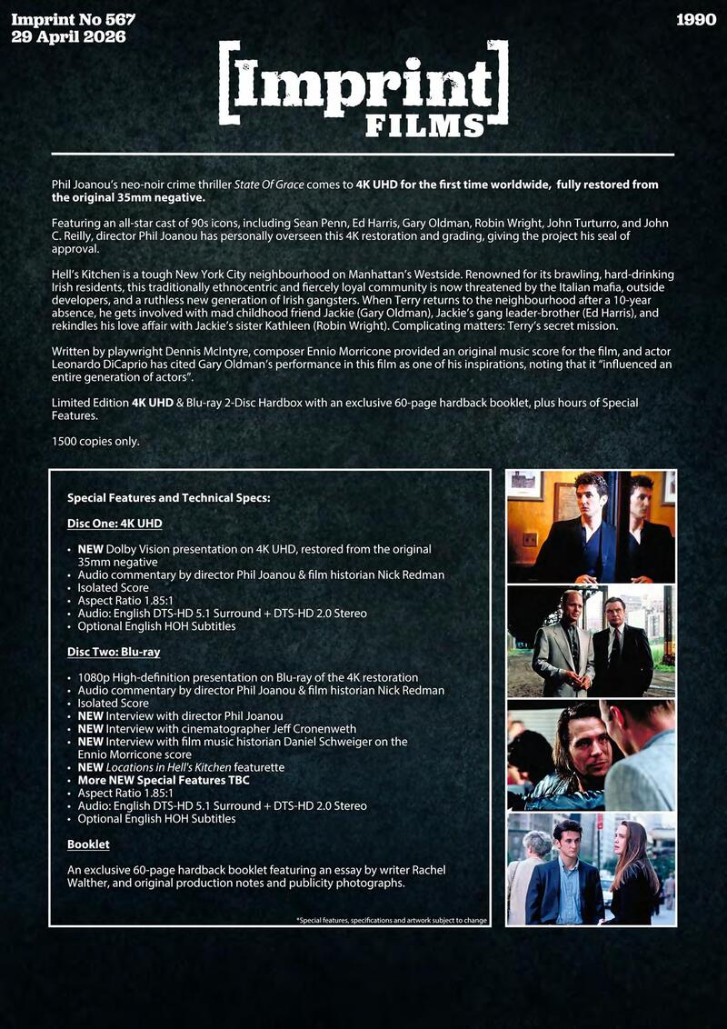 Phil Joanou's neo-noir crime thriller State Of Grace comes to 4K Blu-ray for the first time worldwide, fully restored from the original 35mm negative.
