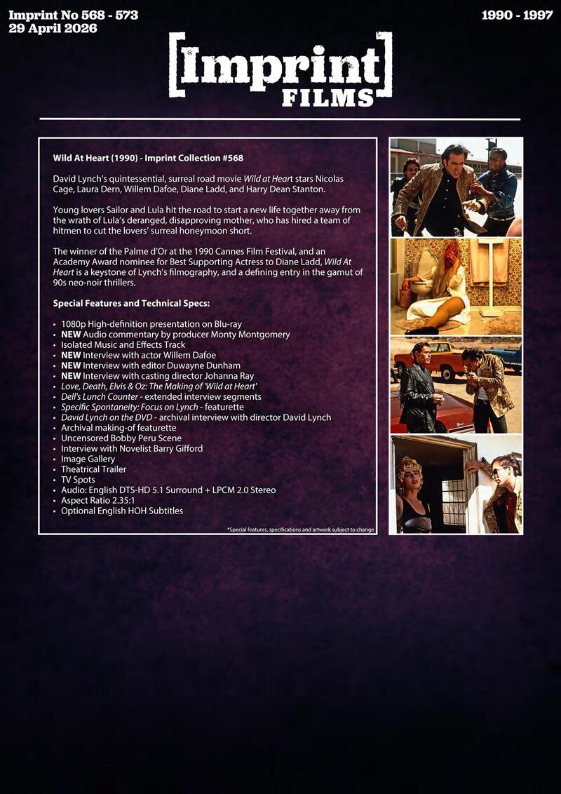 The winner of the Palme d'Or at the 1990 Cannes Film Festival, and an Academy Award nominee for Best Supporting Actress to Diane Ladd, Wild At Heart is a keystone of Lynch's filmography, and a defining entry in the gamut of 90s neo-noir thrillers.