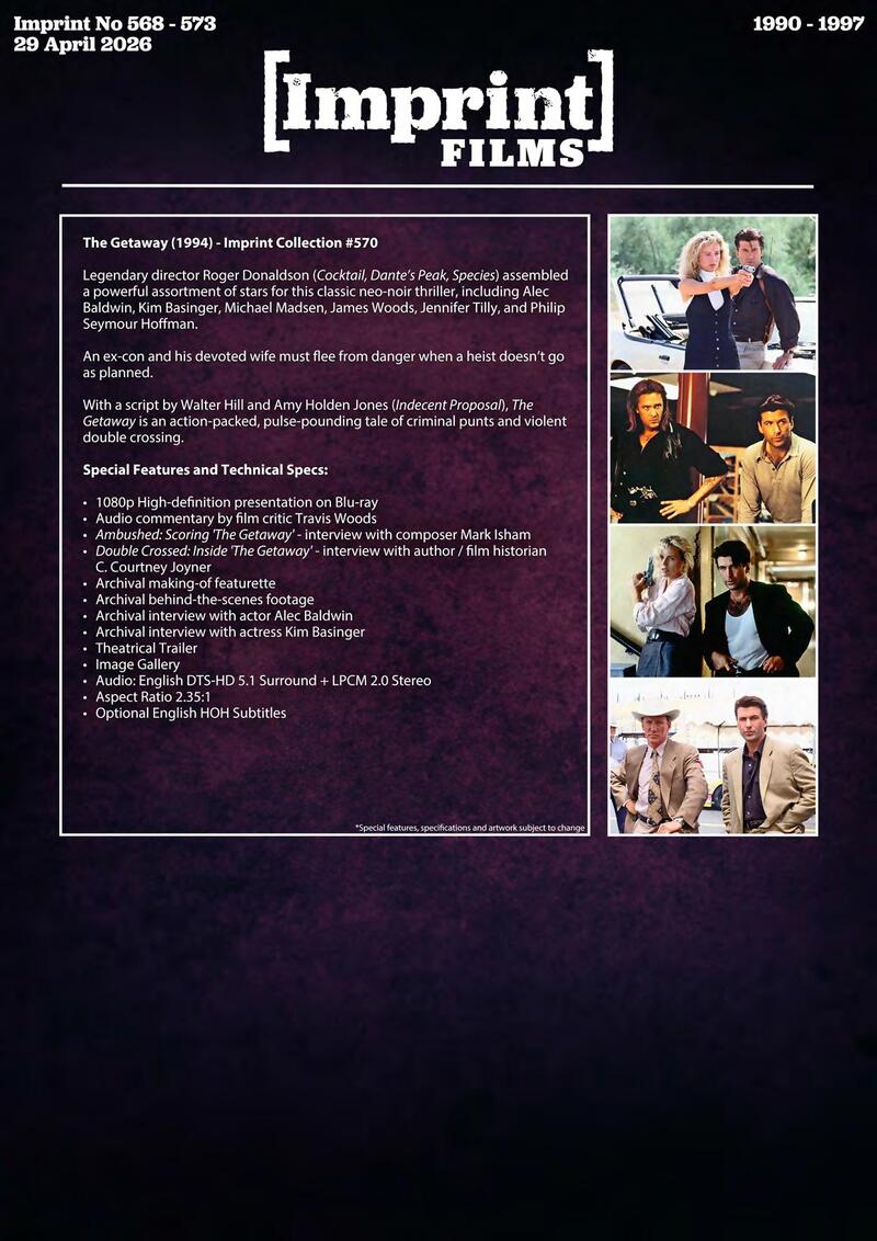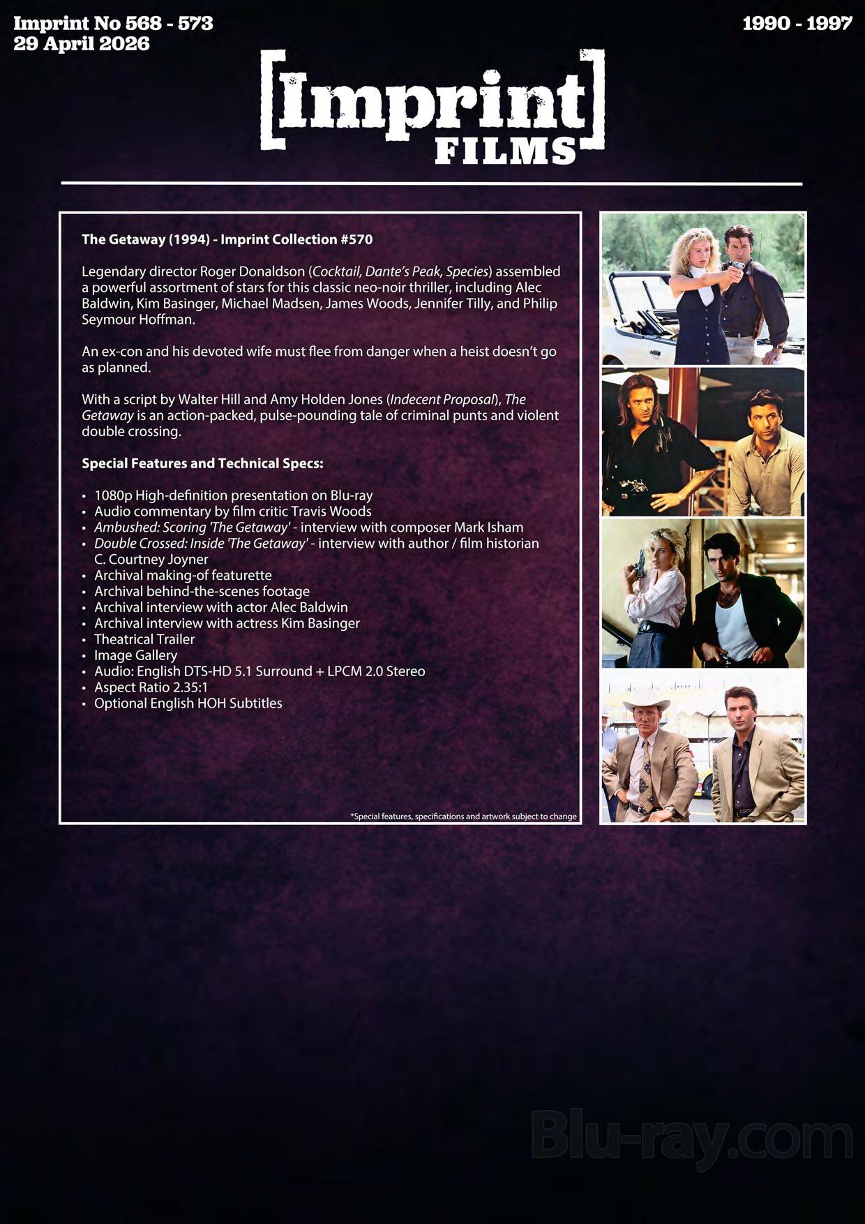 Legendary director Roger Donaldson (Cocktail, Dante's Peak, Species) assembled a powerful assortment of stars for this classic neo-noir thriller, including Alec Baldwin, Kim Basinger, Michael Madsen, James Woods, Jennifer Tilly, and Philip Seymour Hoffman. An ex-con and his devoted wife must flee from danger when a heist doesn't go as planned.