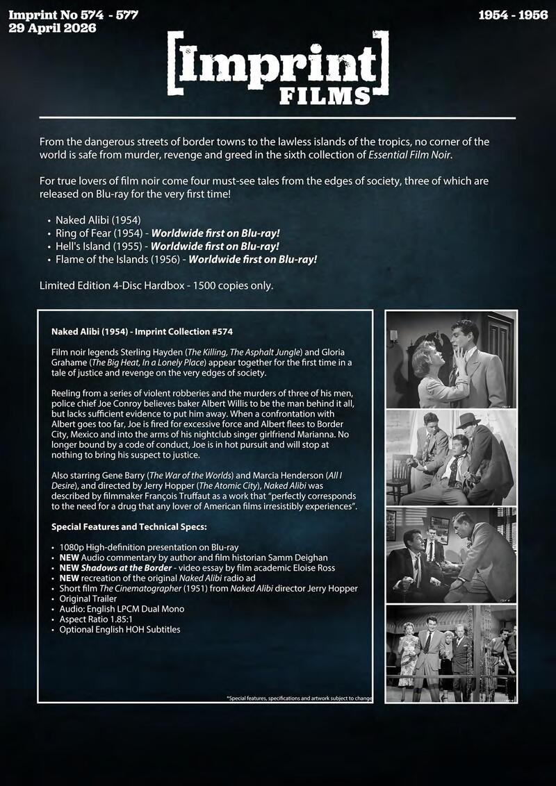 Film noir legends Sterling Hayden (The Killing, The Asphalt Jungle) and Gloria Grahame (The Big Heat, In a Lonely Place) appear together for the first time in a tale of justice and revenge on the very edges of society. Reeling from a series of violent robberies and the murders of three of his men, police chief Joe Conroy believes baker Albert Willis to be the man behind it all, but lacks sufficient evidence to put him away. When a confrontation with Albert goes too far, Joe is fired for excessive force and Albert flees to Border City, Mexico and into the arms of his nightclub singer girlfriend Marianna. No longer bound by a code of conduct, Joe is in hot pursuit and will stop at nothing to bring his suspect to justice.