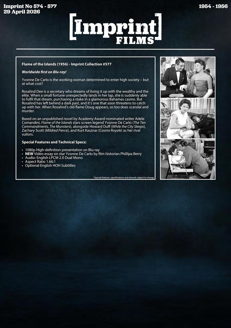 Based on an unpublished novel by Academy Award-nominated writer Adele Comandini, Flame of the Islands stars screen legend Yvonne De Carlo (The Ten Commandments, The Munsters), alongside Howard Duff (While the City Sleeps), Zachary Scott (Mildred Pierce), and Kurt Kasznar (Casino Royale) as her rival suitors.