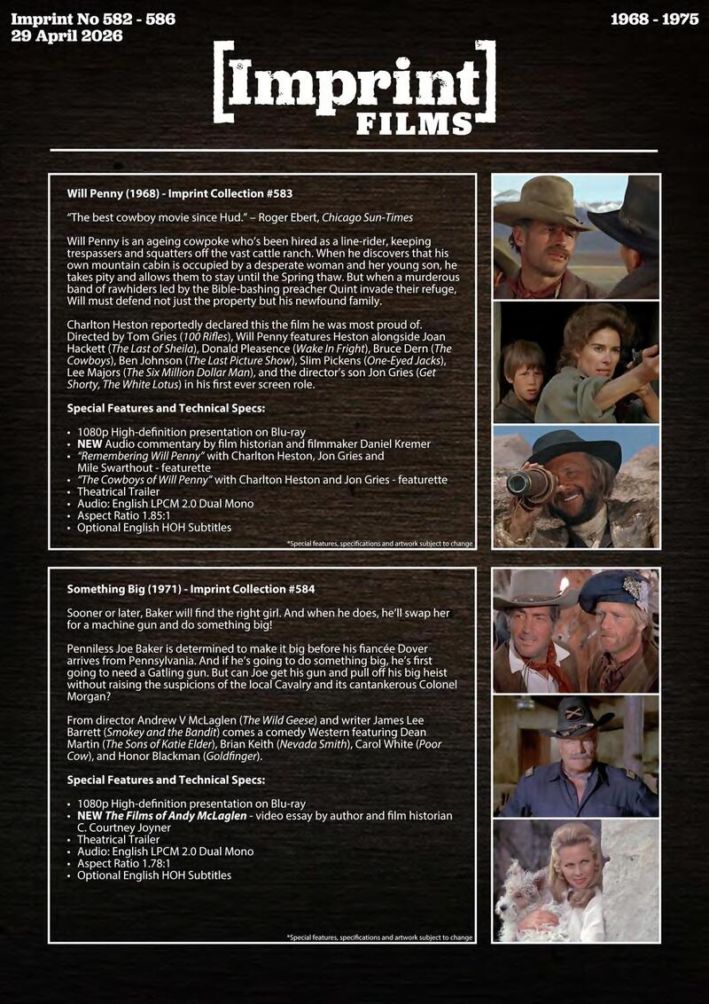 Charlton Heston reportedly declared this the film he was most proud of. Directed by Tom Gries (100 Rifles), Will Penny features Heston alongside Joan Hackett (The Last of Sheila), Donald Pleasance (Wake In Fright), Bruce Dern (The Cowboys), Ben Johnson (The Last Picture Show), Slim Pickens (One-Eyed Jacks), Lee Majors (The Six Million Dollar Man), and the director's son Jon Gries (Get Shorty, The White Lotus) in his first ever screen role.