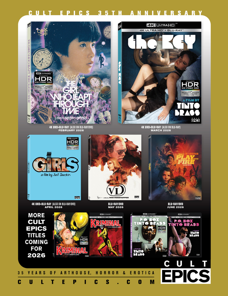 This year, Cult Epics celebrates its 35th anniversary, and its owner, Nico B., has informed us that he is preparing several 4K Blu-ray premieres and additional Blu-ray releases. Among the upcoming releases are Umberto Lenzi's cult film Kriminal (1966), Tinto Brass's P.O. Box Tinto Brass (1996), and a box set with early Ornella Muti films.