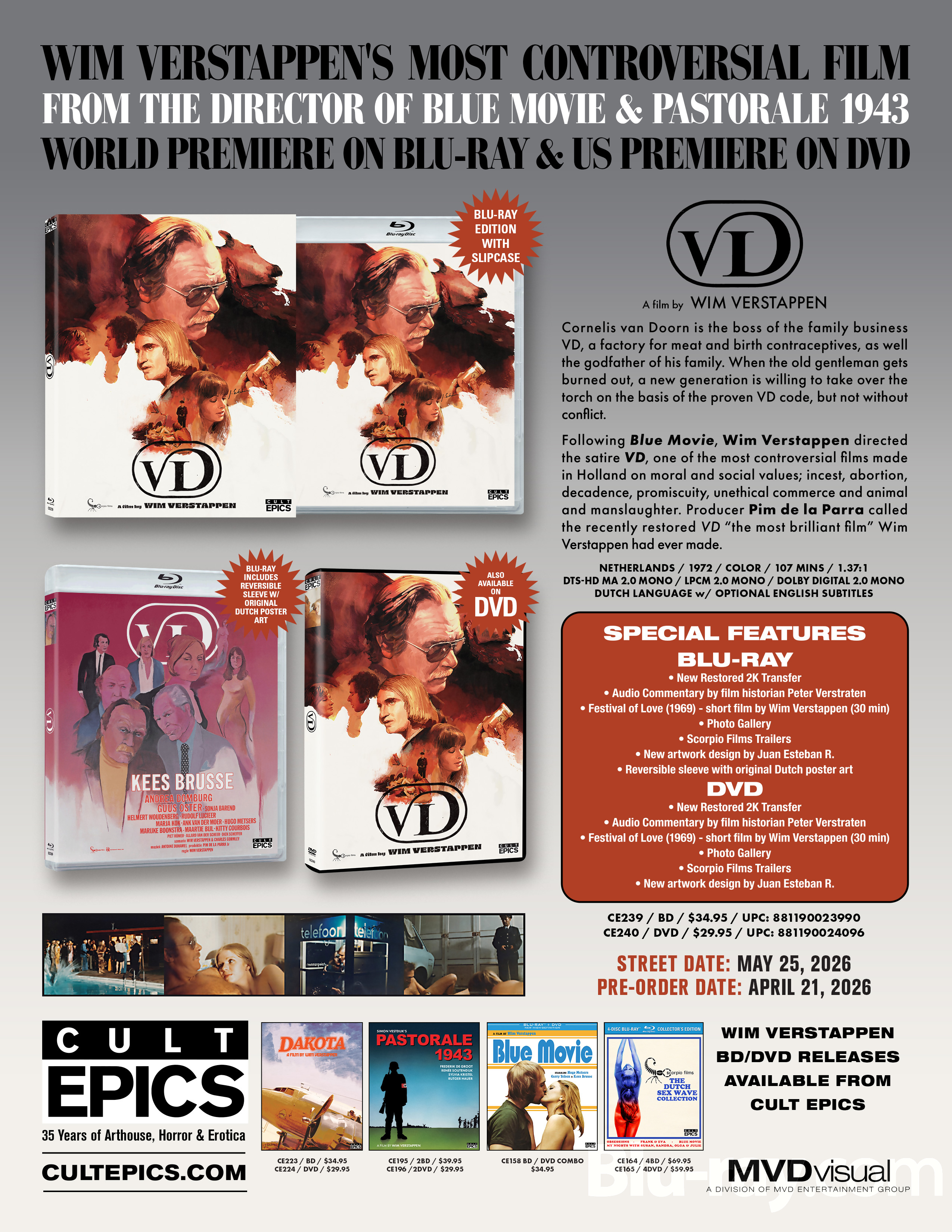 Cult Epics has provided final details for its upcoming Blu-ray release of Wim Verstappen's VD (1972), starring Kees Brusse and Andrea Domburg. The release is scheduled to arrive on the market on May 25.