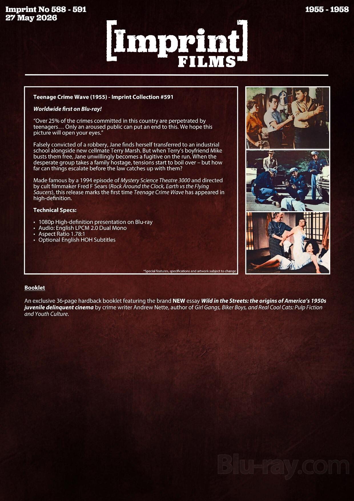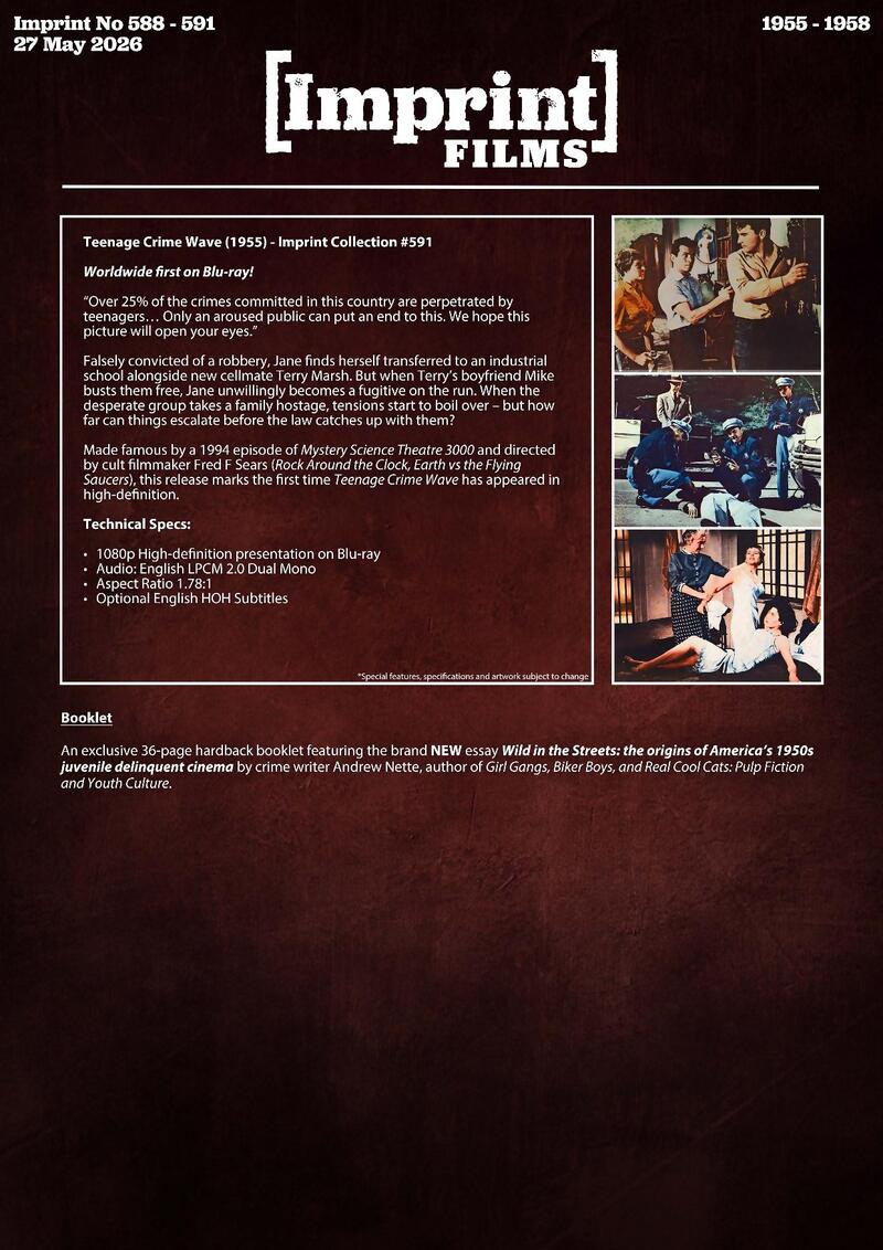 "Over 25% of the crimes committed in this country are perpetrated by teenagers… Only an aroused public can put an end to this. We hope this picture will open your eyes." Falsely convicted of a robbery, Jane finds herself transferred to an industrial school alongside new cellmate Terry Marsh. But when Terry's boyfriend Mike busts them free, Jane unwillingly becomes a fugitive on the run. When the desperate group takes a family hostage, tensions start to boil over – but how far can things escalate before the law catches up with them? Made famous by a 1994 episode of Mystery Science Theatre 3000 and directed by cult filmmaker Fred F Sears (Rock Around the Clock, Earth vs the Flying Saucers), this release marks the first time Teenage Crime Wave has appeared in high-definition.
