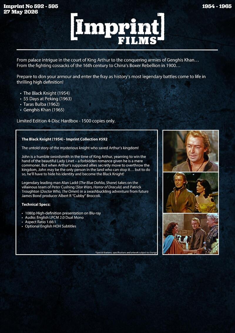 John is a humble swordsmith in the time of King Arthur, yearning to win the hand of the beautiful Lady Linet – a forbidden romance given he is a mere commoner. But when Arthur's supposed allies secretly move to overthrow the kingdom, John may be the only person in the land who can stop it… but to do so, he'll have to hide his identity and become the Black Knight! Legendary leading man Alan Ladd (The Blue Dahlia, Shane) takes on the villainous team of Peter Cushing (Star Wars, Horror of Dracula) and Patrick Troughton (Doctor Who, The Omen) in a swashbuckling adventure from future James Bond producer Albert R "Cubby" Broccoli.