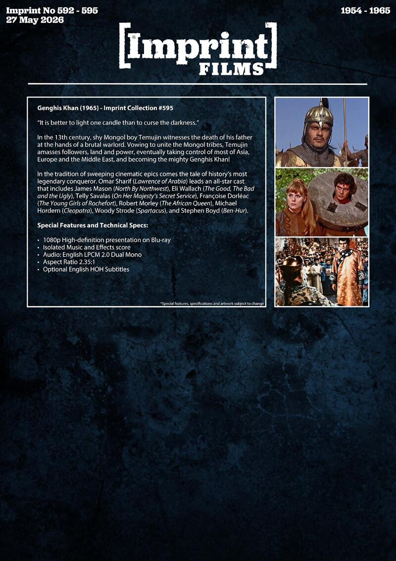 In the 13th century, shy Mongol boy Temujin witnesses the death of his father at the hands of a brutal warlord. Vowing to unite the Mongol tribes, Temujin amasses followers, land and power, eventually taking control of most of Asia, Europe and the Middle East, and becoming the mighty Genghis Khan! In the tradition of sweeping cinematic epics comes the tale of history's most legendary conqueror. Omar Sharif (Lawrence of Arabia) leads an all-star cast that includes James Mason (North By Northwest), Eli Wallach (The Good, The Bad and the Ugly), Telly Savalas (On Her Majesty's Secret Service), Françoise Dorléac (The Young Girls of Rochefort), Robert Morley (The African Queen), Michael Hordern (Cleopatra), Woody Strode (Spartacus), and Stephen Boyd (Ben-Hur).