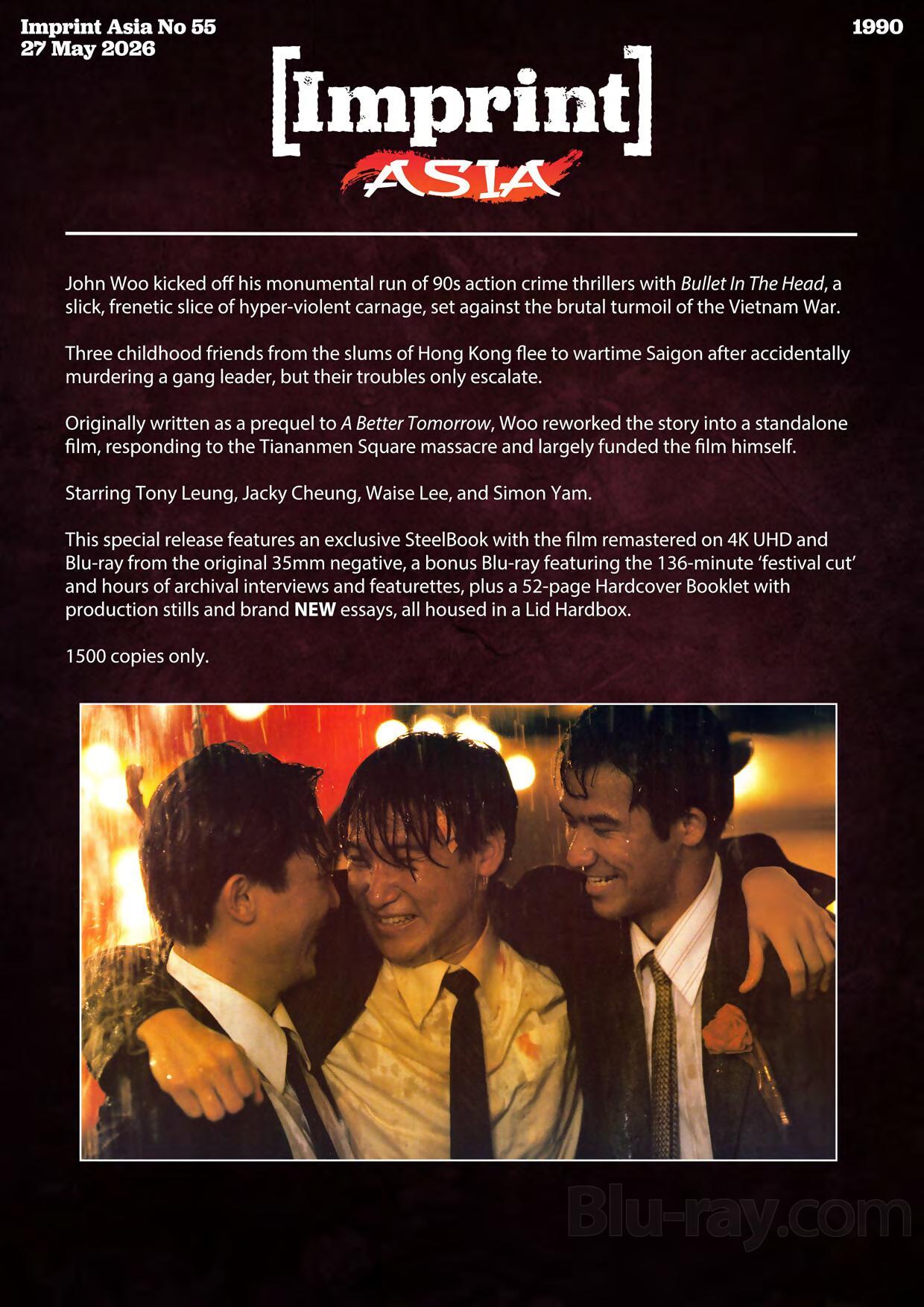 John Woo kicked off his monumental run of 90s action crime thrillers with Bullet In The Head, a slick, frenetic slice of hyper-violent carnage, set against the brutal turmoil of the Vietnam War. Three childhood friends from the slums of Hong Kong flee to wartime Saigon after accidentally murdering a gang leader, but their troubles only escalate. Originally written as a prequel to A Better Tomorrow, Woo reworked the story into a standalone film, responding to the Tiananmen Square massacre and largely funded the film himself. Starring Tony Leung, Jacky Cheung, Waise Lee, and Simon Yam.