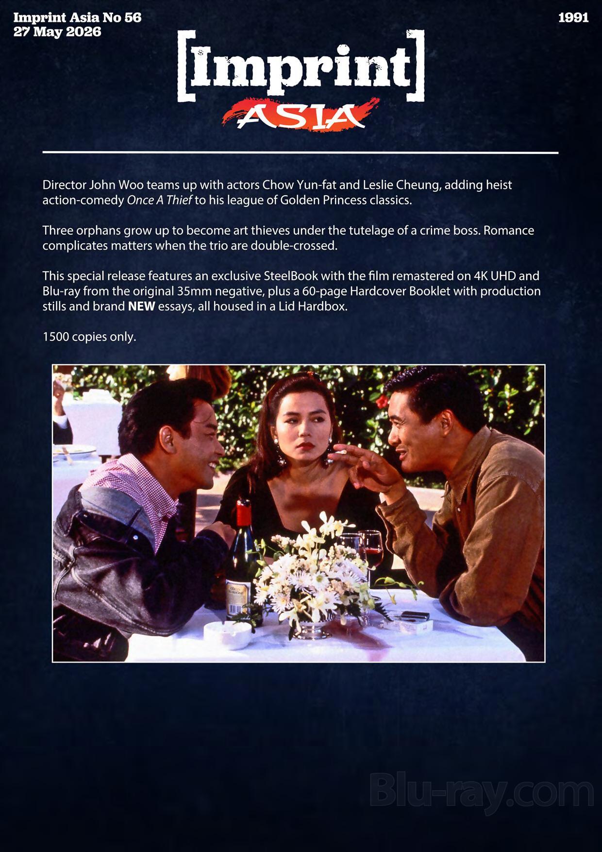 Director John Woo teams up with actors Chow Yun-fat and Leslie Cheung, adding heist action-comedy Once A Thief to his league of Golden Princess classics. Three orphans grow up to become art thieves under the tutelage of a crime boss. Romance complicates matters when the trio are double-crossed.