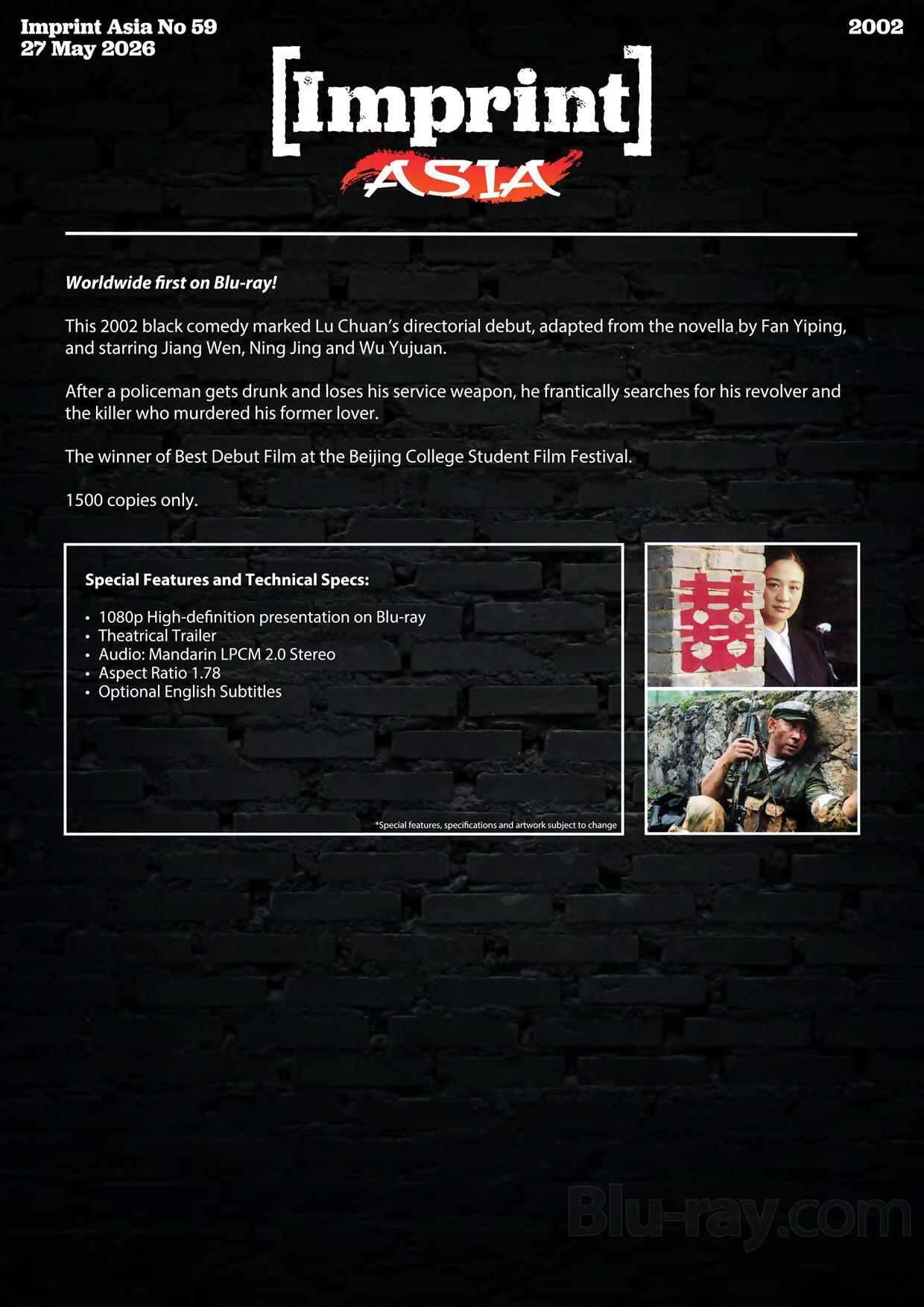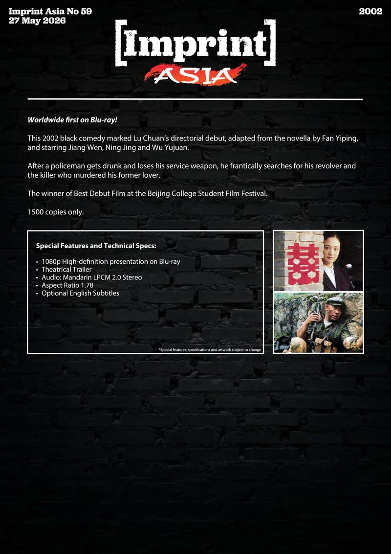 This 2002 black comedy marked Lu Chuan's directorial debut, adapted from the novella by Fan Yiping, and starring Jiang Wen, Ning Jing and Wu Yujuan. After a policeman gets drunk and loses his service weapon, he frantically searches for his revolver and the killer who murdered his former lover. The winner of Best Debut Film at the Beijing College Student Film Festival.