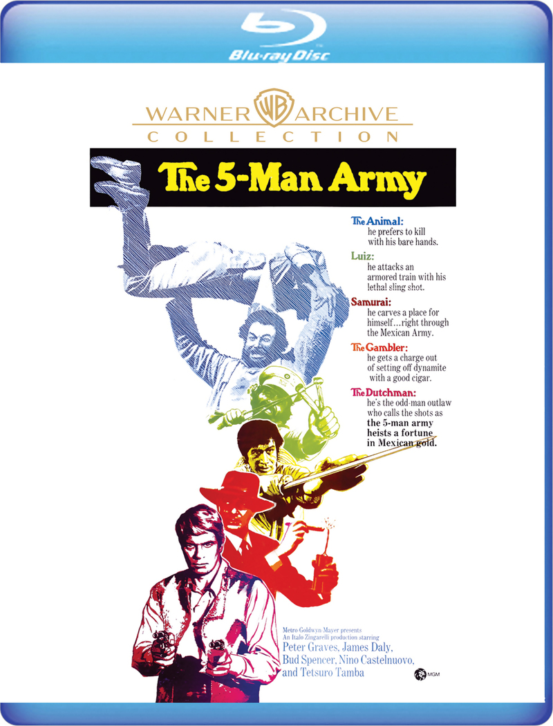 Description: Where the army leads, action fans, especially Spaghetti Western fans- will want to follow. Set during the Mexican Revolution, The 5-Man Army is a niftily executed tale of mercenaries who, on behalf of rebel forces, take on a mission to rob a trainload of gold. Make that a suicide mission, because the train is heavily armored, armed with troops, cannons, and machine guns, and traveling a route guarded by more soldiers. Peter Graves, then known for his role as mastermind Jim Phelps on TV's Mission: Impossible, faces another odds-defying task as the Dutchman, leader of a handpicked commando squad consisting of a strongman, an explosives expert, a circus acrobat, and a Samurai swordsman. This cult-favorite film co-stars James Daly (Medical Center) and Spaghetti-Western favorite Bud Spencer (They Call Me Trinity), with a screenplay co-written by Dario Argento. Famed composer Ennio Morricone's throbbing score amplifies the on-screen action of this ready-to-be-rediscovered film that, wrote The New York Times' Vincent Canby is "for anybody who enjoys lean, taut suspense with no fiddling around." All aboard!