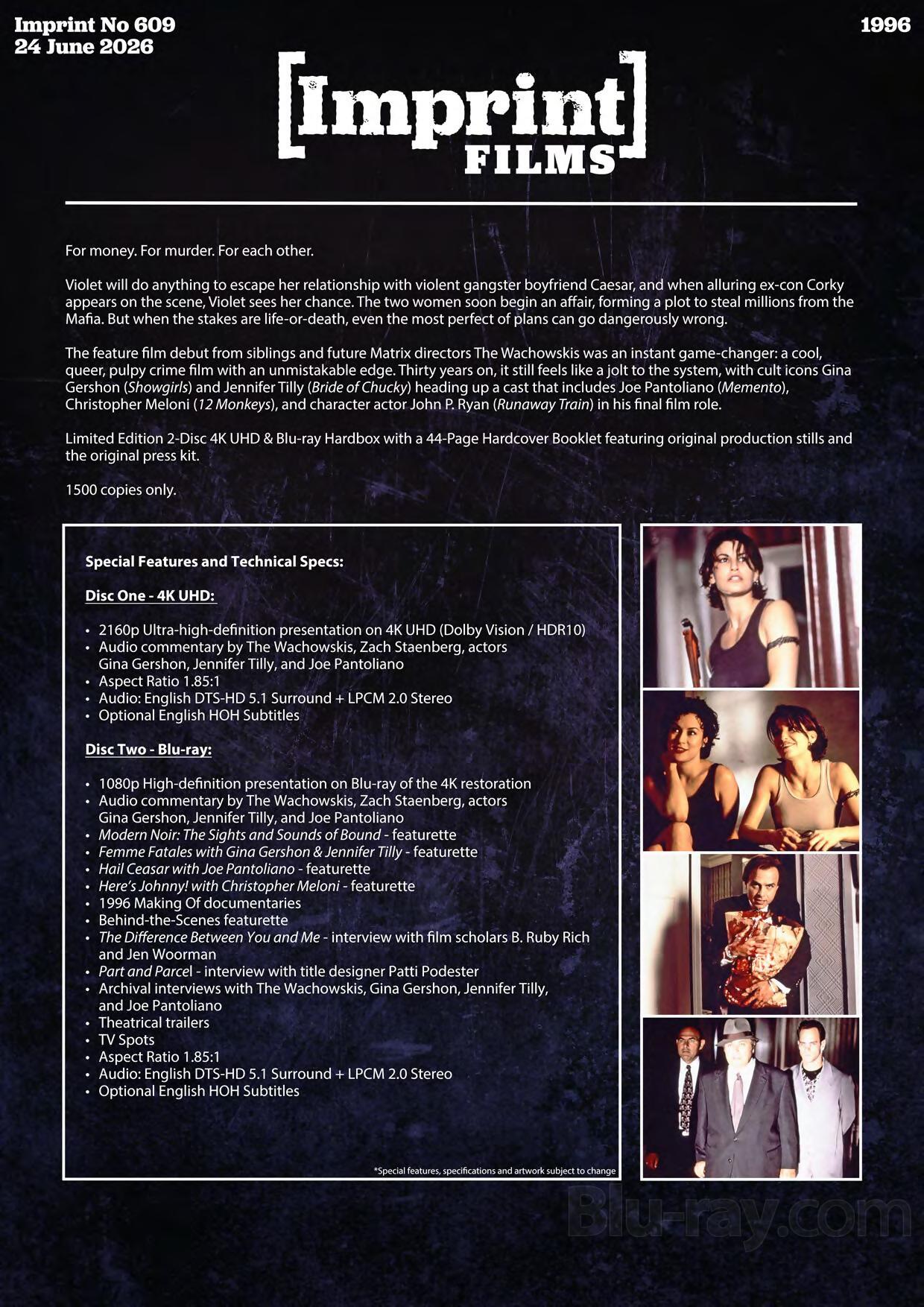 The feature film debut from siblings and future Matrix directors The Wachowskis was an instant game-changer: a cool, queer, pulpy crime film with an unmistakable edge. Thirty years on, it still feels like a jolt to the system, with cult icons Gina Gershon (Showgirls) and Jennifer Tilly (Bride of Chucky) heading up a cast that includes Joe Pantoliano (Memento), Christopher Meloni (12 Monkeys), and character actor John P. Ryan (Runaway Train) in his final film role.