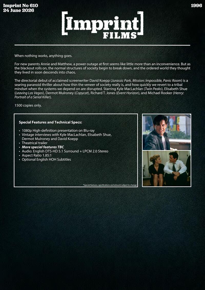 The directorial debut of acclaimed screenwriter David Koepp (Jurassic Park, Mission: Impossible, Panic Room) is a searing paranoid thriller about how thin the veneer of society really is, and how quickly we revert to a tribal mindset when the systems we depend on are disrupted. Starring Kyle MacLachlan (Twin Peaks), Elisabeth Shue (Leaving Las Vegas), Dermot Mulroney (Copycat), Richard T. Jones (Event Horizon), and Michael Rooker (Henry: Portrait of a Serial Killer).