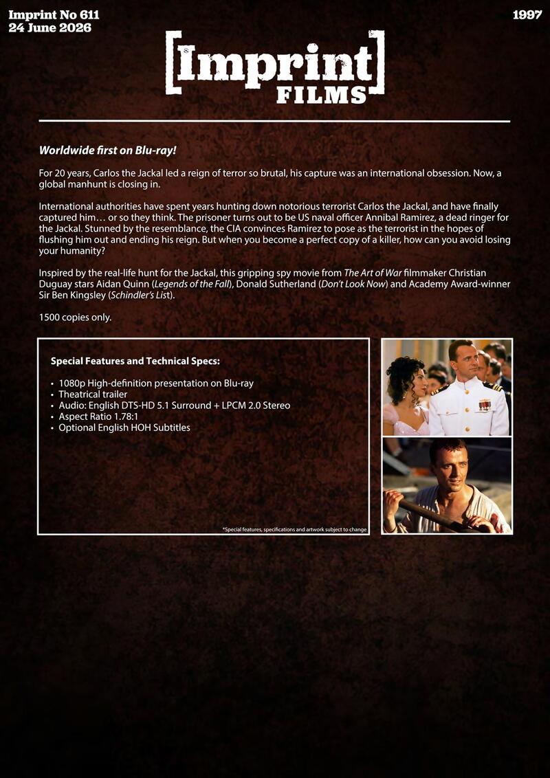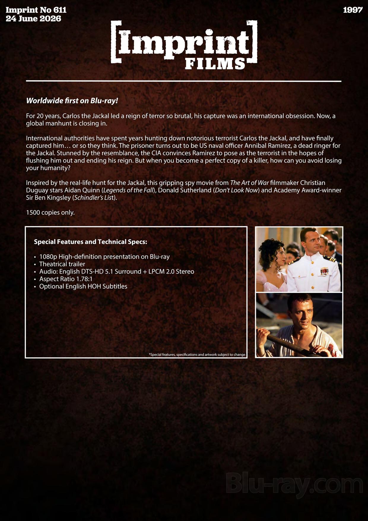 Inspired by the real-life hunt for the Jackal, this gripping spy movie from The Art of War filmmaker Christian Duguay stars Aidan Quinn (Legends of the Fall), Donald Sutherland (Don't Look Now) and Academy Award-winner Sir Ben Kingsley (Schindler's List).