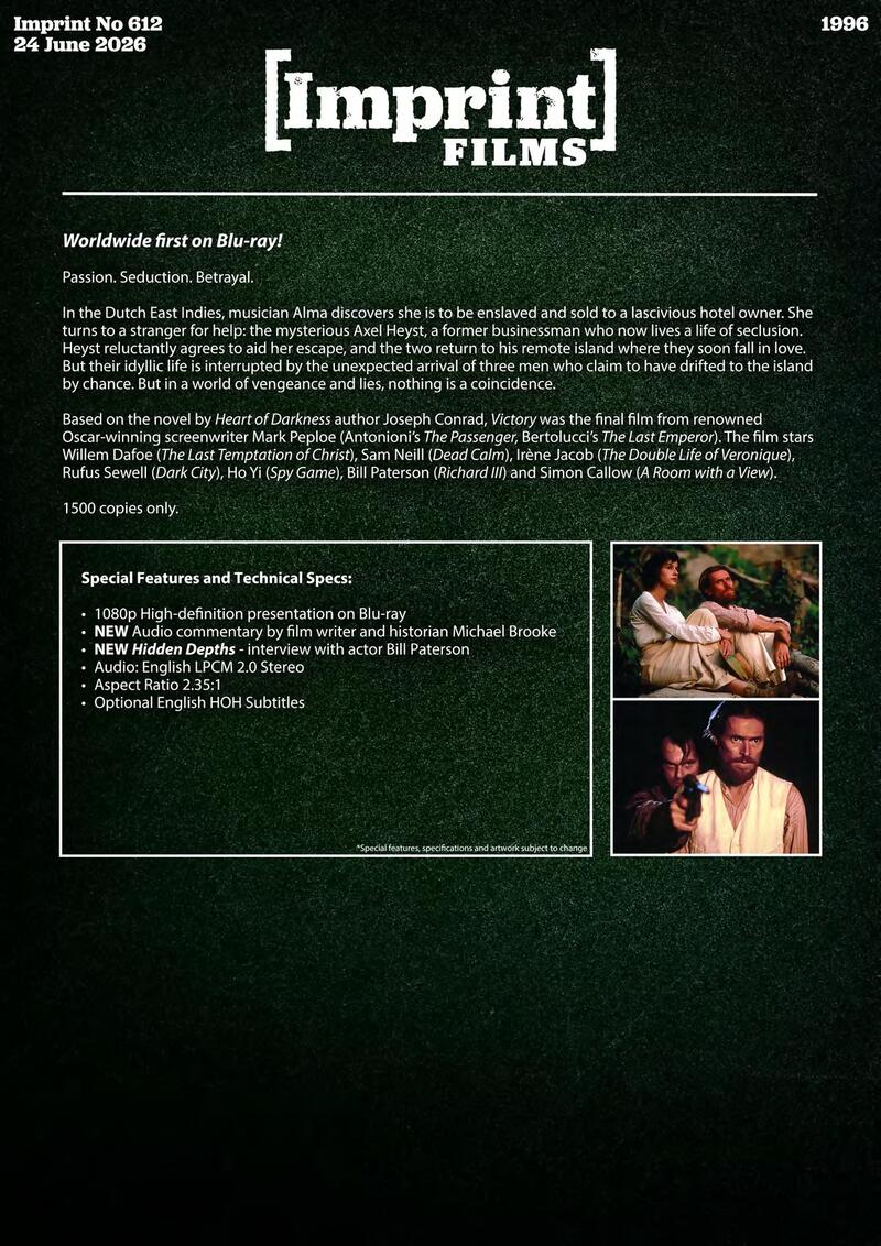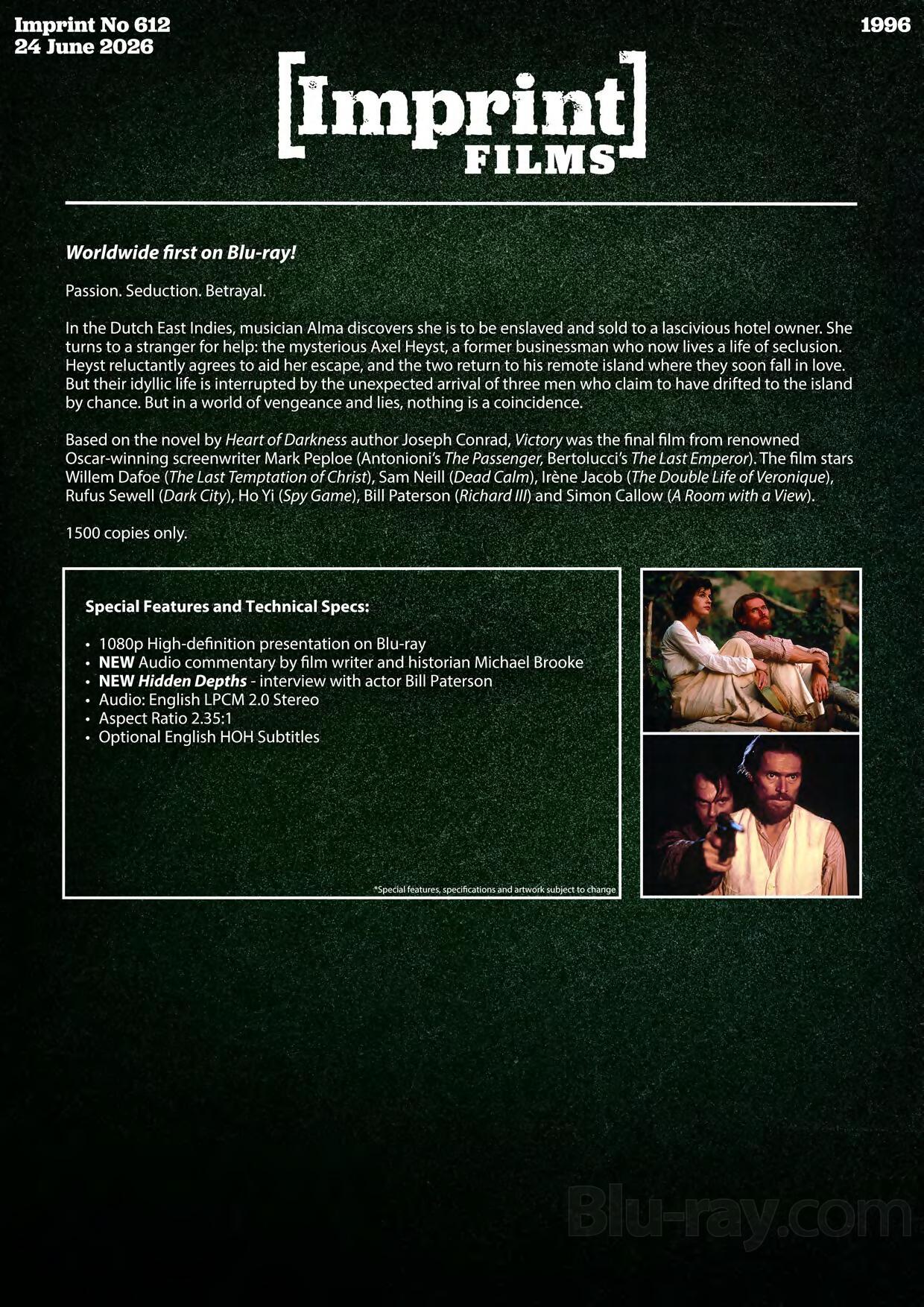 Based on the novel by Heart of Darkness author Joseph Conrad, Victory was the final film from renowned Oscar-winning screenwriter Mark Peploe (Antonioni's The Passenger, Bertolucci's The Last Emperor). The film stars Willem Dafoe (The Last Temptation of Christ), Sam Neill (Dead Calm), Irène Jacob (The Double Life of Veronique), Rufus Sewell (Dark City), Ho Yi (Spy Game), Bill Paterson (Richard III) and Simon Callow (A Room with a View).