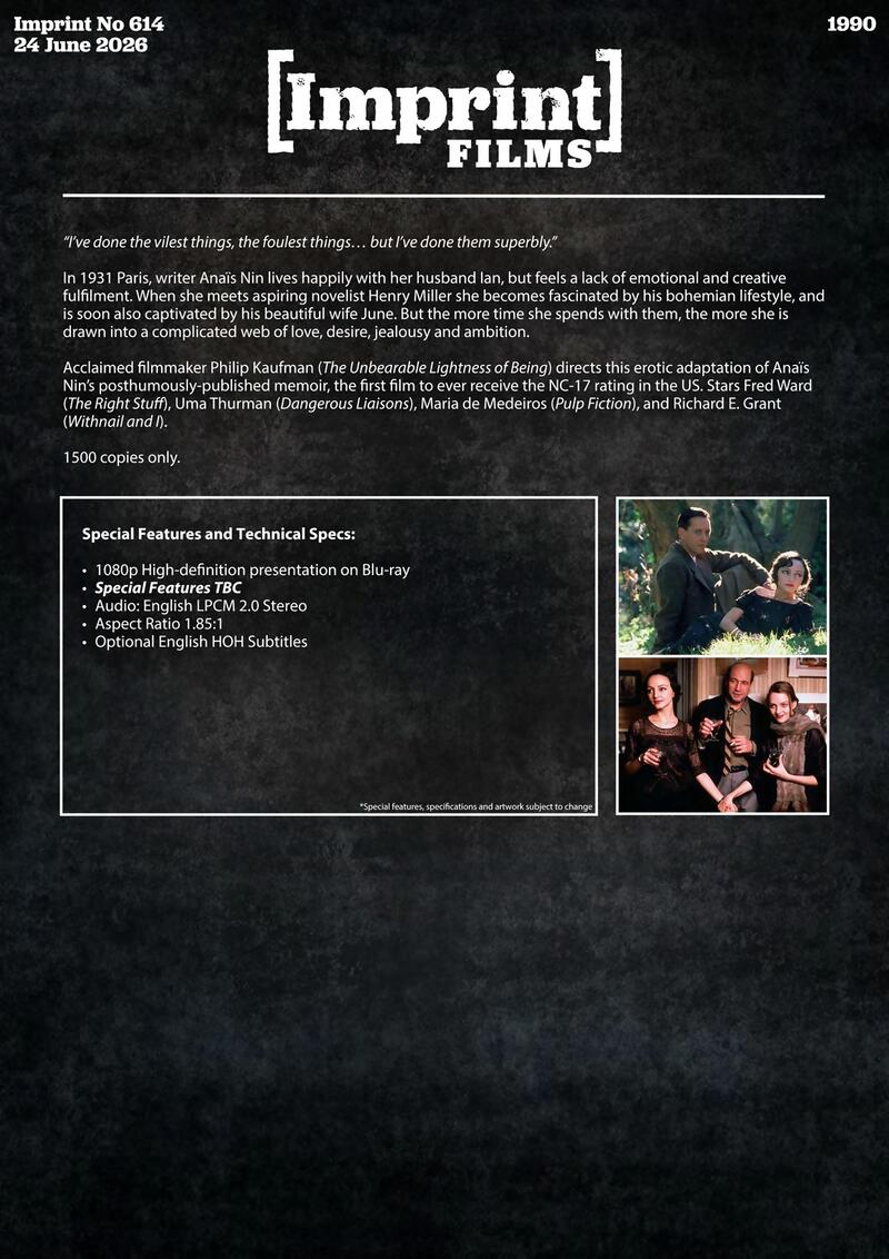 Acclaimed filmmaker Philip Kaufman (The Unbearable Lightness of Being) directs this erotic adaptation of Anaïs Nin's posthumously-published memoir, the first film to ever receive the NC-17 rating in the US. Stars Fred Ward (The Right Stuff), Uma Thurman (Dangerous Liaisons), Maria de Medeiros (Pulp Fiction), and Richard E. Grant (Withnail and I).